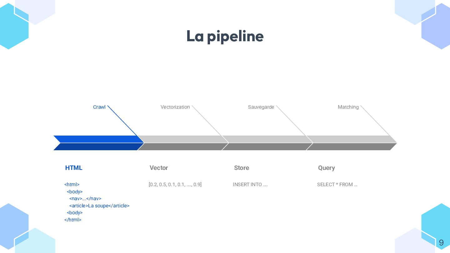8. La pipeline Crawl HTML <html> <body> <nav>...</nav> <article>La soupe</article> <body>