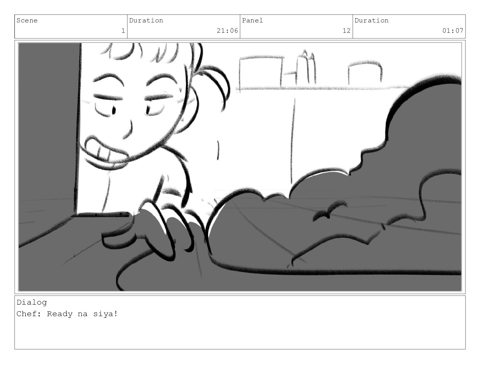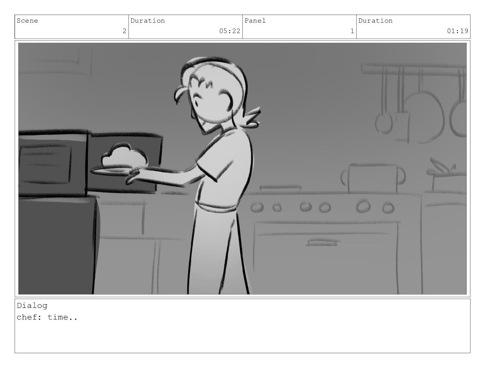 Scene 1 Duration 21:06 Panel 12 Duration 01:07 Dialog Chef: