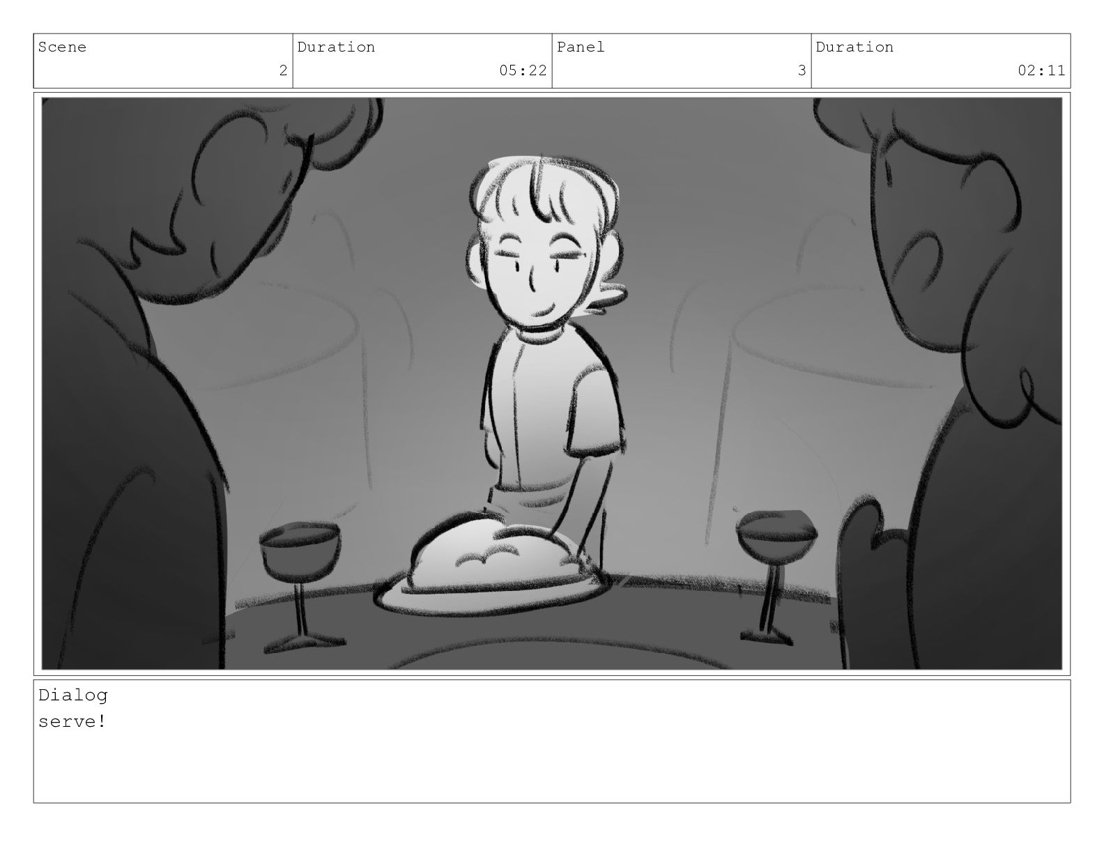 Scene 2 Duration 05:22 Panel 3 Duration 02:11 Dialog serve!