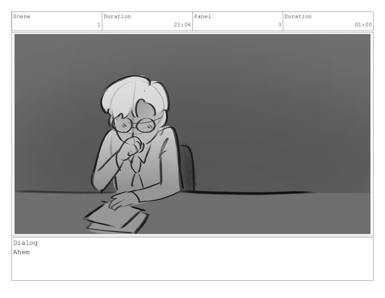 Scene 1 Duration 21:06 Panel 3 Duration 01:00 Dialog Ahem