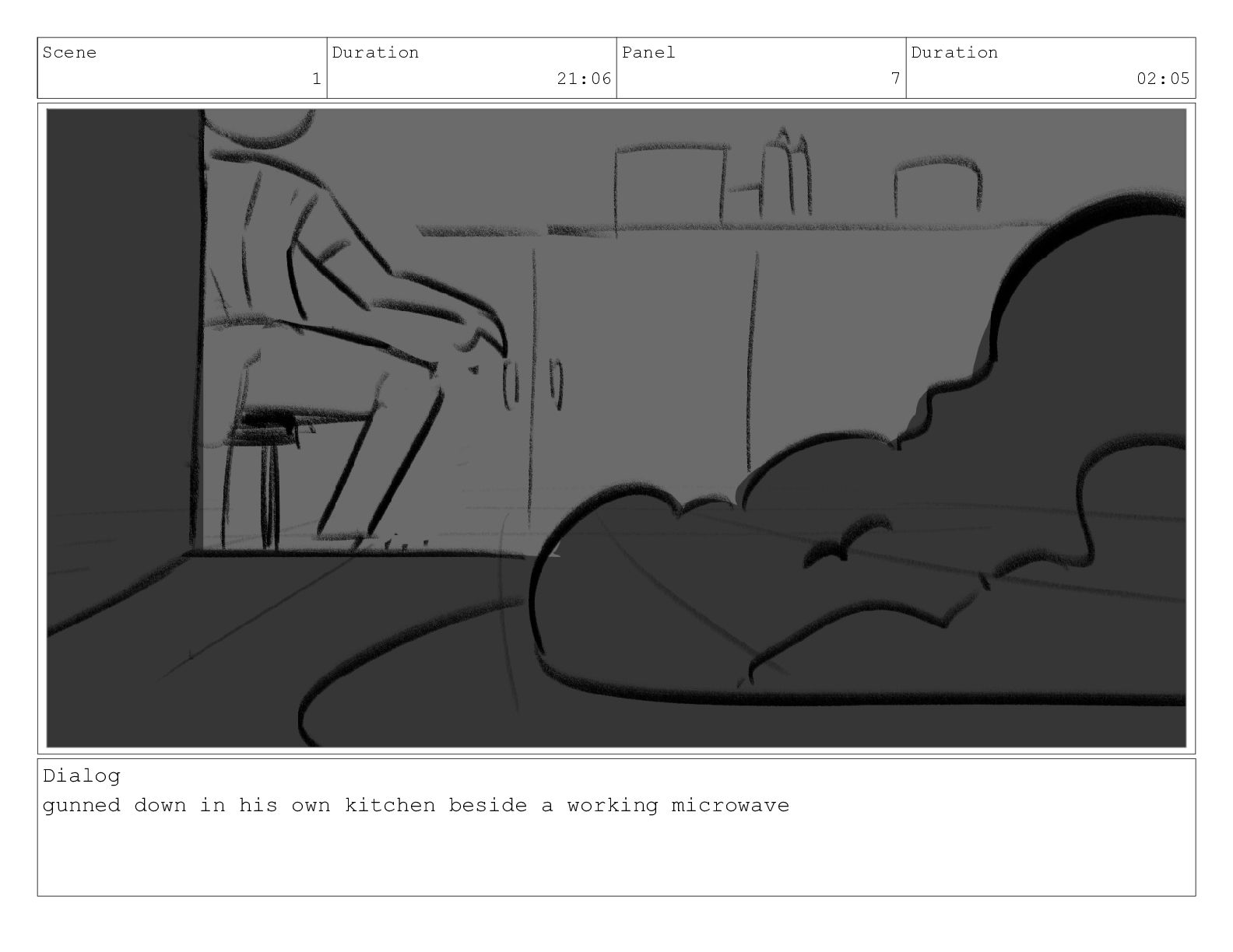 Scene 1 Duration 21:06 Panel 7 Duration 02:05 Dialog gunned