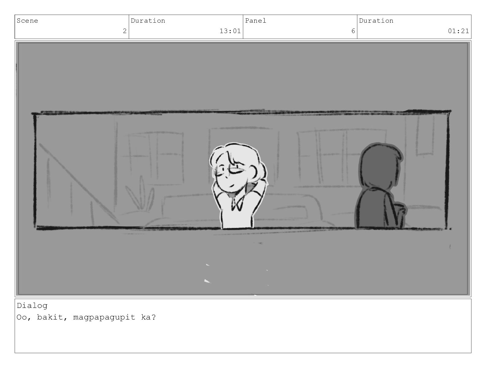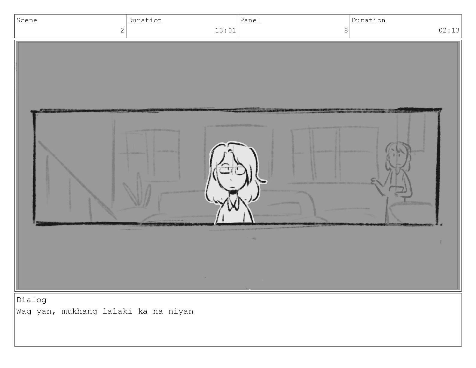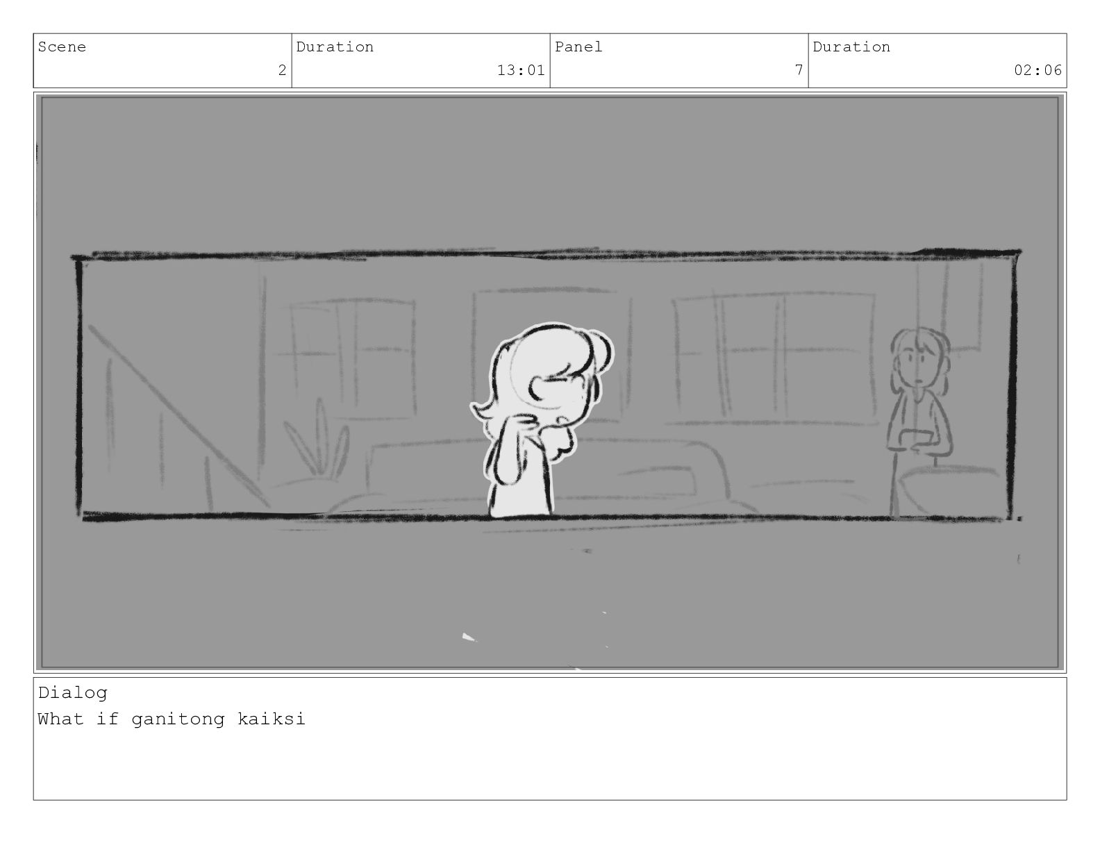 Scene 2 Duration 13:01 Panel 7 Duration 02:06 Dialog What