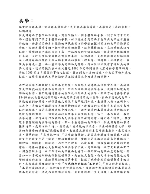 時,還影響到了西方本體論的爭執,所以現在看到的西方美學與美學史有嚴重 的偏狹,什麼樣的西方本體論的爭執是西方的學者在探討西方的美學的論著的 時候,從西方最重要的一個哲學家開始起算,就是蘇格拉底,在此時期應該可 以說,希臘的文字還沒固定下來,所以所有的言論與紀錄,都是學生柏拉圖寫 出來的,至於怎麼記載蘇拉底對美的事物,如何描述,是在柏拉圖的對話錄裡 面,描述蘇格拉底根 2 個人物來談美的事物,裡面有一個特點,蘇格拉底一直 問美本身是什麼,而一直回答美的事物是什麼,所以對話中沒有掌握到美的事 物之描述,這樣的觀點在中世紀將近 1000 年的時間裡面之黑暗神學壟罩時期, 將近 1000 西方有關美的事物之描述,將回到美本身的描述,非美的事物知識之 描述,文藝復興近代美學初期都還在探討美本身而非美的事物, 西方的美學大概只擅長美的本質向度,西方悠久的傳統無法恰當表現,美的本 質是理論戲的創造指導美的創作,所以西方的傳統美學基本上沒辦法知道美的 事物的創作,我們通稱這樣子的美學教作形而上的美學,那西方的這些學者在 19-20 世紀初發現這個問題,而展開西方所謂的設計美學,與西方後現代美學, 同樣的我們如果看,好像其他文明沒有美學這門知識,出現落入西方文明中心 主義中,其他文明難道沒有美的事物的描述,連西方的文明都有美的本質象度 以外的描述,只是在學科系統中被忽略了,西方的美的本質象度之外的描述到 底有怎樣的傳統,一個就是柏拉圖的學生亞里斯多德,寫了一本西方第一本的 美學的書,但這本著作不被認為是美學著作所探討的書,稱之為「詩學」 ,其實 這本書應該翻為美學較為恰當,第一本最完整的美學著作,但是因為他的書名 採用詩學,或西方的「詩」 ,指的是:就希臘的字來看,字義叫做操作之學,那 寫的是什麼的操作呢?戲劇的操作,也就是怎麼寫劇本怎麼演出戲劇,來寫這本 書,簡單的說: 「怎麼說神話」 「怎麼演出神話」那因為希臘文字的關係,跟西 方文字的詩文字是一樣的,所以翻作詩學,實際上是在描述怎麼來創作描述一 個神話一個戲劇,同樣的,西方文明裡面,也有另外一個本質項度之外的重要 書籍,這樣的書籍也是長期被西方美學家乎視,簡單的講,西方文明裡面有了 一個亞里斯多德,所以西方的美學裡面也有了一個所謂的意涵向度的描述,那 另外一本書呢就剛好是件折這個專業,是在紀元前後,西元 0 年的前後也就是 耶穌誕生的前後,是維楚維斯的建築十書,描述了眼睛看到的造型物重要的法 則,在描述建築裡面提出一些「 「 「 「形式向度的描述 形式向度的描述 形式向度的描述 形式向度的描述( ( ( (主要的 主要的 主要的 主要的) ) ) )」 」 」 」 「意涵向度的描述」 「本質向度的描述」 ,但被西方的哲學家忽略,因為西方都在探討美的本質與美 的本身是什麼,造成西方的傳統美學一直到康德都一直是這樣,美學的論著解