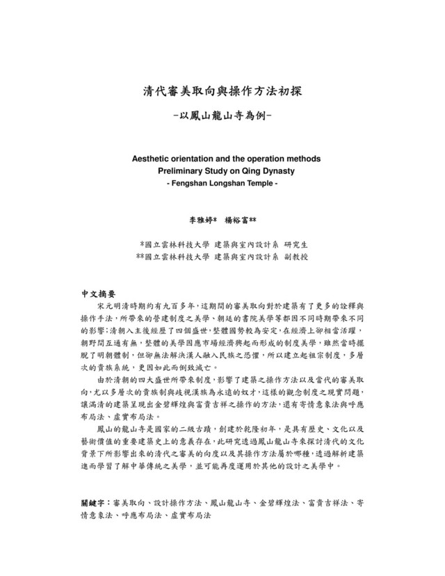 years, during which the aesthetic orientation interpretation and operating practices for building brought about by the construction system of aesthetics, and so the court's College aesthetics different for different periods; Qing Dynasty White experienced four flourishing more stability, the overall national strength in the economy is quite active, ruling and opposition parties each other's needs, the overall aesthetic system formed in response to the rise of the market economy and the aesthetic, though it was to get rid of the Ming system, butbut fear of Han Chinese into the nation can not be solved, to establish ancestral system, the aristocratic system of multi-level, more so down caused perish. Four Golden Age of the Qing Dynasty brought the system affect the operation of the building, as well as contemporary aesthetic orientation, especially in multi-level aristocracy and discrimination Han forever I like the concept of the system of practical problems, let Manchu building showing the method of the operation of the resplendent with wealth and good fortune, there are always focussed image of law echoes layout method, the actual situation layout method. Longshan Temple in Fengshan two monuments of the country, created in the early years of Qianlong, is the significance of the important buildings of historical, cultural and artistic value in the history of the existence of this study Fengshan Longshan Temple to explore the cultural background of the Qing Dynasty under impact from Qing Dynasty aesthetic dimension as well as its method of operation belongs to which through parse building and thus learn about traditional Chinese aesthetics, and may be re-used in other design aesthetics. Keywords: Aesthetic orientation, the design method of operation, the Fengshan Longshan Temple, resplendent law, wealth and good fortune, always focussed imagery, echoing the layout method, the actual situation layout