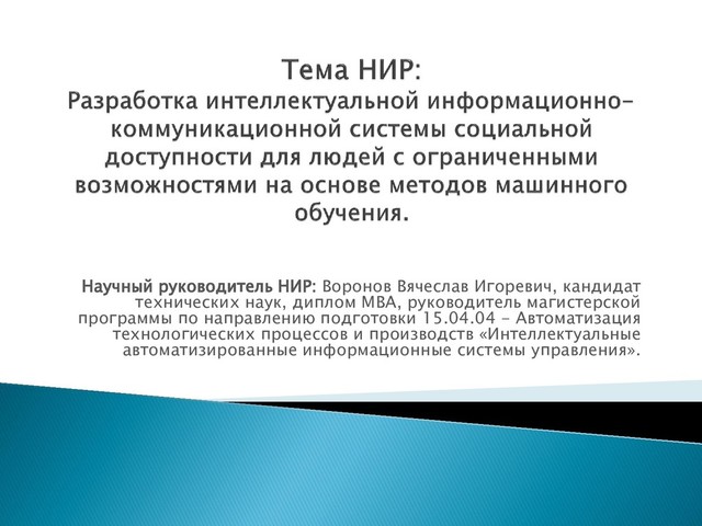научно- технический отчёт; 1 Программное обеспечение; - В разработке Монография; 1 Приоритетные направления развития науки и образования: Монография. Под общей редакцией Г.Ю. Гуляева. Пенза, 2017. Глава 11, с. 97 - 108 Статьи в научных журналах из списка ВАК; Статьи в научных изданиях, индексируемых в БД Scopus; 2 1. Воронов В.И., Генчель К.В., Артемов М.Д., Безумнов Д.Н."Surdotelephone" Project with Convolutional Neural Network. Материалы Международной научно технической конференции «2018 Systems of signals generating and processing in the field of on board communications» (IEEE Conference #43917) 2. Гончаренко А.А., Воронова Л.И., Воронов В. И., Ежов А. А., Горячев Д. В. Automated Support System Designing for people with limited communication. Материалы Международной научно-технической конференции «2018 Systems of signals generating and processing in the field of on board communications» (IEEE Conference #43917) Свидетельства о регистрации программы для ЭВМ; Пока нет Тезисов докладов в сборниках материалов конференций; 8 1. Воронова Л.И., Бедняков А.И., Толмачев Р.В. Генчель К.В. Голос больших данных» - компьютерный переводчик для глухих и слабослышащих людей .Доклад на Международном фестивале "Технологии будущего в пространстве культуры", Москва, Музей Имени А.А. Бахрушина, 9- 15 октября 2017. Программа фестиваля стр.11 2. Воронова Л.И., Воронов В.И., Генчель К.В. The sign language recognition project for disabled people with hearing violation about. Materials of conferences (Munich, Germany, 31 October - 5 November 2017): «EDUCATION AND SCIENCE WITHOUT BORDERS» 3. Воронов В.И., Генчель К.В. Архитектура и программная реализация комплекса распознавания жестового языка для инвалидов с нарушением слуха. Доклад на VII Международной научно- технической и научно-методической конференции "Актуальные проблемы инфокоммуникаций в науке и образовании" , Санкт-Петербург, Санкт-Петербургский государственный университет телекоммуникаций им. проф. М.А. Бонч-Бруевича, 28 февраля – 1 марта 2018. Программа конференции стр.26 4. Воронов В.И., Генчель К.В., Артемов М.Д., Безумнов Д.Н. "Surdotelephone" Project with Convolutional Neural Network. Доклад на Международной научно-технической конференции «2018 Systems of signals generating and processing in the field of on board communications» (IEEE Conference #43917).,15 марта 2018 г. Программа конференции с. 8