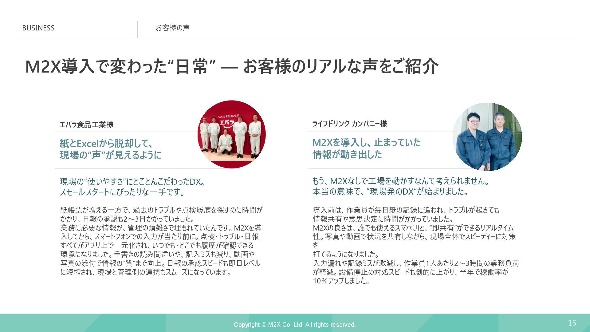 業務に必要な情報が、管理の煩雑さで埋もれていたんです。M2Xを導 入してから、スマートフォンでの入力が当たり前に。点検・トラブル・日報 すべてがアプリ上で一元化され、いつでも・どこでも履歴が確認できる 環境になりました。手書きの読み間違いや、記入ミスも減り、動画や 写真の添付で情報の“質”まで向上。日報の承認スピードも即日レベル に短縮され、現場と管理側の連携もスムーズになっています。 エバラ食品工業様 紙とExcelから脱却して、 現場の“声”が見えるように 導入前は、作業員が毎日紙の記録に追われ、トラブルが起きても 情報共有や意思決定に時間がかかっていました。 M2Xの良さは、誰でも使えるスマホUIと、“即共有”ができるリアルタイム 性。写真や動画で状況を共有しながら、現場全体でスピーディーに対策 を 打てるようになりました。 入力漏れや記録ミスが激減し、作業員1人あたり2〜3時間の業務負荷 が軽減。設備停止の対処スピードも劇的に上がり、半年で稼働率が 10%アップしました。 ライフドリンク カンパニー様 M2Xを導入し、止まっていた 情報が動き出した 16 現場の“使いやすさ”にとことんこだわったDX。 スモールスタートにぴったりな一手です。 もう、M2Xなしで工場を動かすなんて考えられません。 本当の意味で、“現場発のDX”が始まりました。 BUSINESS お客様の声 M2X導入で変わった“日常” — お客様のリアルな声をご紹介