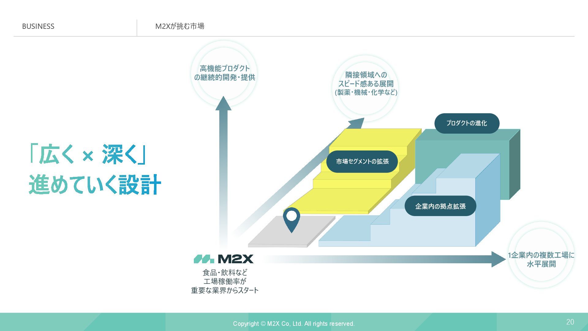 M2Xが挑む市場 「広く × 深く」 食品・飲料など 工場稼働率が 重要な業界からスタート 1企業内の複数工場に 水平展開 高機能プロダクト の継続的開発・提供 隣接領域への スピード感ある展開 (製薬・機械・化学など) 進めていく設計 市場セグメントの拡張 プロダクトの進化 企業内の拠点拡張