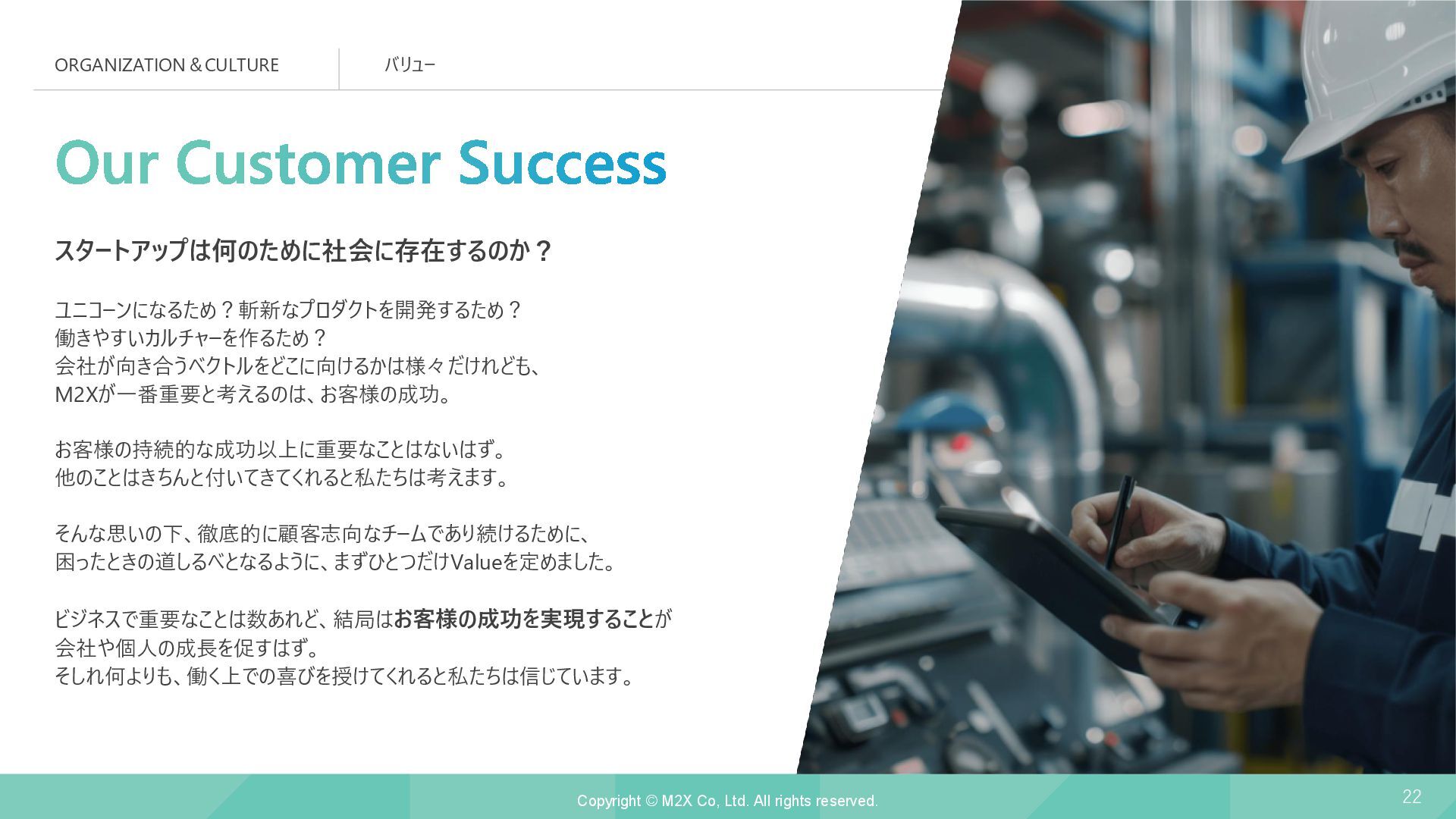 ユニコーンになるため?斬新なプロダクトを開発するため? 働きやすいカルチャーを作るため? 会社が向き合うベクトルをどこに向けるかは様々だけれども、 M2Xが一番重要と考えるのは、お客様の成功。 お客様の持続的な成功以上に重要なことはないはず。 他のことはきちんと付いてきてくれると私たちは考えます。 そんな思いの下、徹底的に顧客志向なチームであり続けるために、 困ったときの道しるべとなるように、まずひとつだけValueを定めました。 ビジネスで重要なことは数あれど、結局はお客様の成功を実現することが 会社や個人の成長を促すはず。 そしれ何よりも、働く上での喜びを授けてくれると私たちは信じています。 ORGANIZATION&CULTURE バリュー Our Customer Success