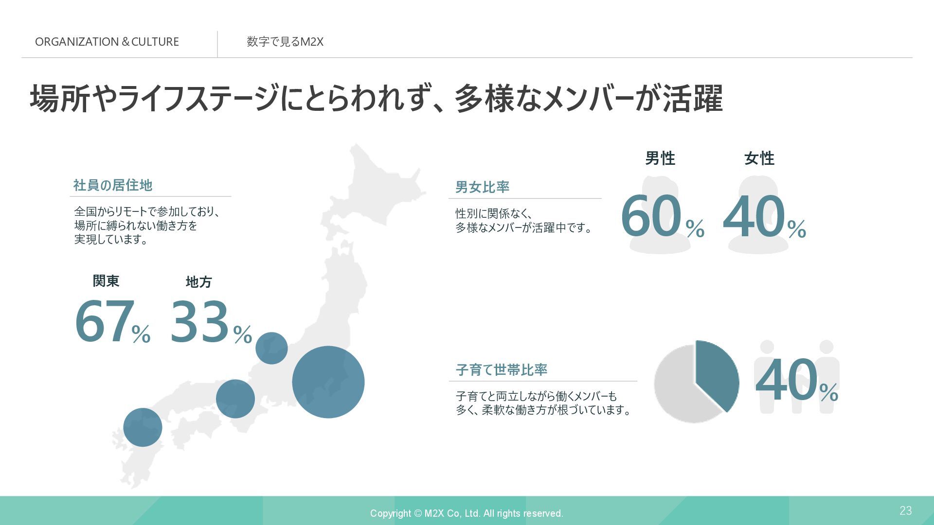 23 関東 ORGANIZATION&CULTURE 数字で見るM2X 地方 全国からリモートで参加しており、 場所に縛られない働き方を 実現しています。 社員の居住地 67% 33% 性別に関係なく、 多様なメンバーが活躍中です。 男女比率 60% 40% 子育てと両立しながら働くメンバーも 多く、柔軟な働き方が根づいています。 子育て世帯比率 40% 場所やライフステージにとらわれず、多様なメンバーが活躍