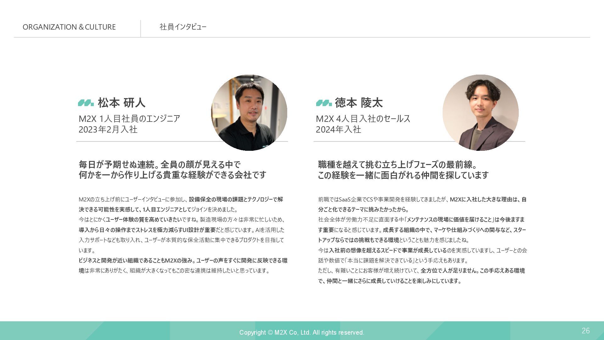 M2Xの立ち上げ前にユーザーインタビューに参加し、設備保全の現場の課題とテクノロジーで解 決できる可能性を実感して、1人目エンジニアとしてジョインを決めました。 今はとにかくユーザー体験の質を高めていきたいですね。製造現場の方々は非常に忙しいため、 導入から日々の操作までストレスを極力減らすUI設計が重要だと感じています。AIを活用した 入力サポートなども取り入れ、ユーザーが本質的な保全活動に集中できるプロダクトを目指して います。 ビジネスと開発が近い組織であることもM2Xの強み。ユーザーの声をすぐに開発に反映できる環 境は非常にありがたく、組織が大きくなってもこの密な連携は維持したいと思っています。 M2X 1人目社員のエンジニア 2023年2月入社 徳本 陵太 前職ではSaaS企業でCSや事業開発を経験してきましたが、M2Xに入社した大きな理由は、自 分ごと化できるテーマに挑みたかったから。 社会全体が労働力不足に直面する中「メンテナンスの現場に価値を届けること」は今後ますま す重要になると感じています。成長する組織の中で、マーケや仕組みづくりへの関与など、スター トアップならではの挑戦もできる環境ということも魅力を感じましたね。 今は入社前の想像を超えるスピードで事業が成長しているのを実感していますし、ユーザーとの会 話や数値で「本当に課題を解決できている」という手応えもあります。 ただし、有難いことにお客様が増え続けていて、全方位で人が足りません。この手応えある環境 で、仲間と一緒にさらに成長していけることを楽しみにしています。 M2X 4人目入社のセールス 2024年入社 26 毎日が予期せぬ連続。全員の顔が見える中で 何かを一から作り上げる貴重な経験ができる会社です 職種を越えて挑む立ち上げフェーズの最前線。 この経験を一緒に面白がれる仲間を探しています ORGANIZATION&CULTURE 社員インタビュー