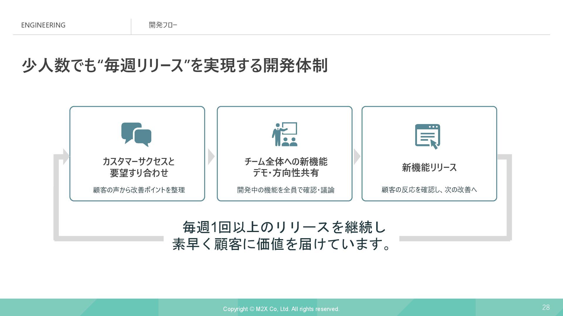 顧客の声から改善ポイントを整理 チーム全体への新機能 デモ・方向性共有 開発中の機能を全員で確認・議論 新機能リリース 顧客の反応を確認し、次の改善へ 28 ENGINEERING 開発フロー 少人数でも“毎週リリース”を実現する開発体制 毎週1回以上のリリースを継続し 素早く顧客に価値を届けています。