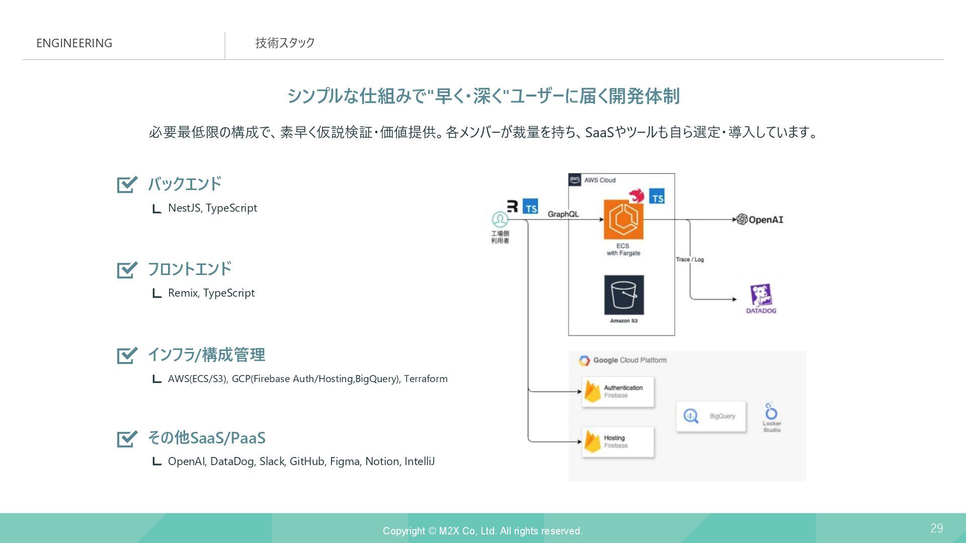 Copyright © M2X Co, Ltd. All rights reserved. 必要最低限の構成で、素早く仮説検証・価値提供。各メンバーが裁量を持ち、SaaSやツールも自ら選定・導入しています。 バックエンド