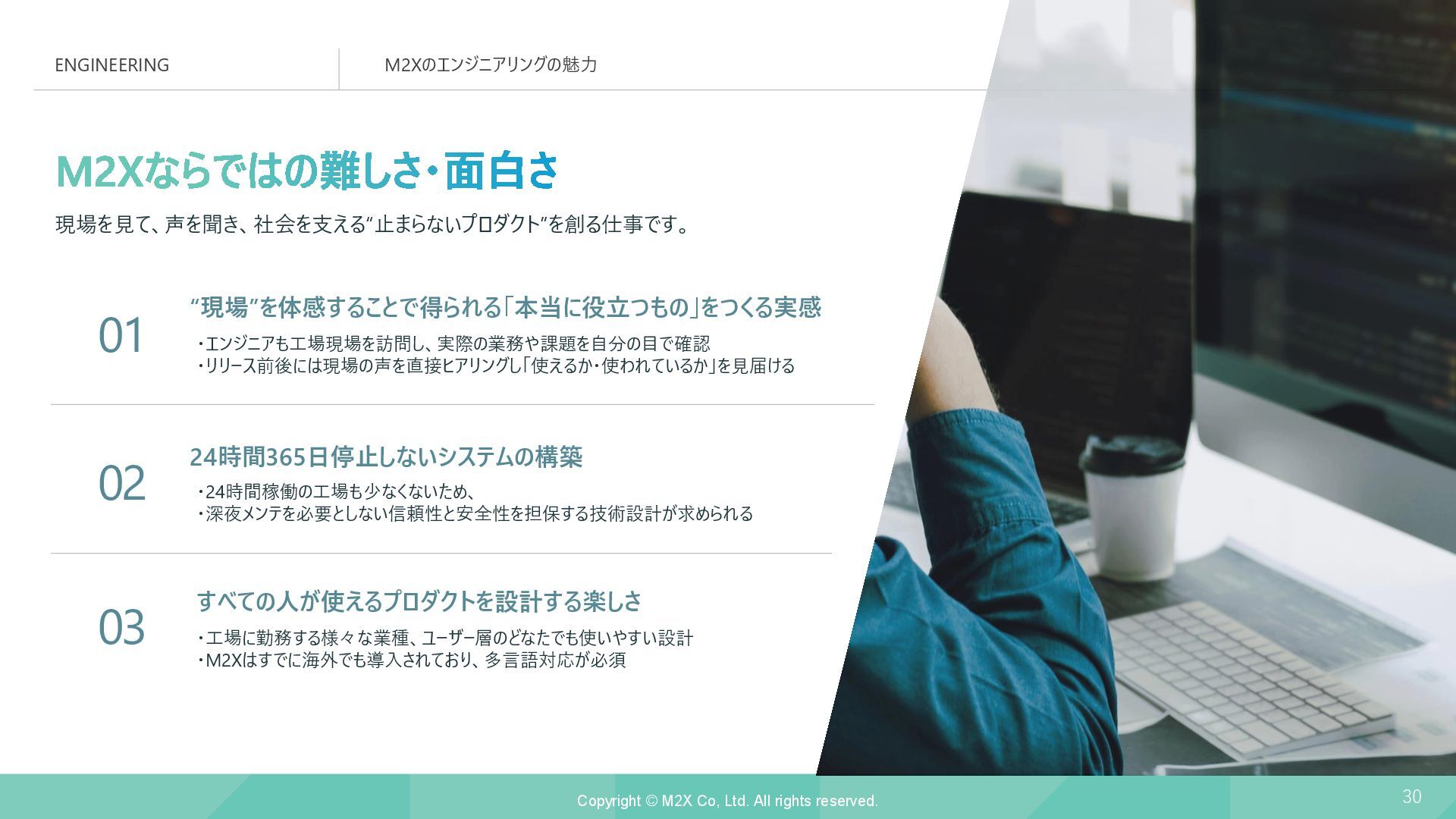 ・リリース前後には現場の声を直接ヒアリングし「使えるか・使われているか」を見届ける 24時間365日停止しないシステムの構築 ・24時間稼働の工場も少なくないため、 ・深夜メンテを必要としない信頼性と安全性を担保する技術設計が求められる すべての人が使えるプロダクトを設計する楽しさ ・工場に勤務する様々な業種、ユーザー層のどなたでも使いやすい設計 ・M2Xはすでに海外でも導入されており、多言語対応が必須 01 02 03 30 現場を見て、声を聞き、社会を支える“止まらないプロダクト”を創る仕事です。 M2Xのエンジニアリングの魅力 M2Xならではの難しさ・面白さ ENGINEERING