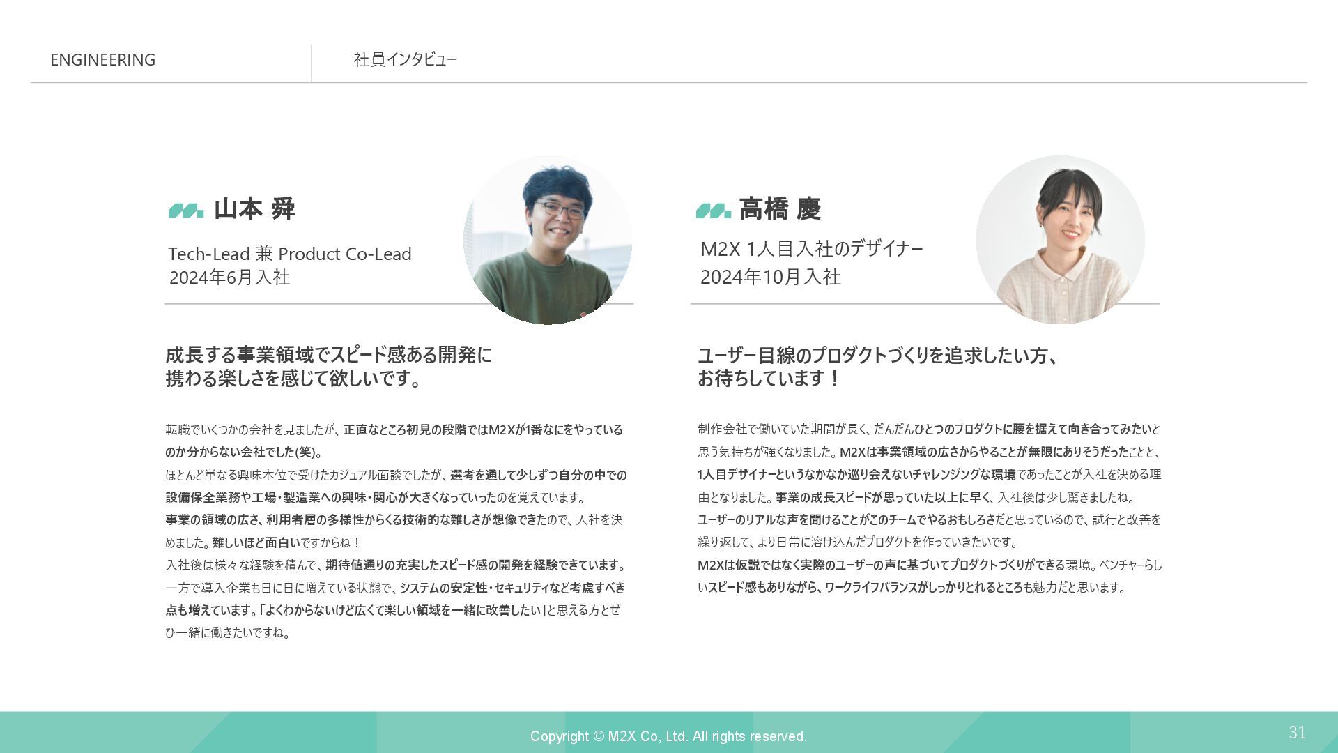 転職でいくつかの会社を見ましたが、正直なところ初見の段階ではM2Xが1番なにをやっている のか分からない会社でした(笑)。 ほとんど単なる興味本位で受けたカジュアル面談でしたが、選考を通して少しずつ自分の中での 設備保全業務や工場・製造業への興味・関心が大きくなっていったのを覚えています。 事業の領域の広さ、利用者層の多様性からくる技術的な難しさが想像できたので、入社を決 めました。難しいほど面白いですからね! 入社後は様々な経験を積んで、期待値通りの充実したスピード感の開発を経験できています。 一方で導入企業も日に日に増えている状態で、システムの安定性・セキュリティなど考慮すべき 点も増えています。「よくわからないけど広くて楽しい領域を一緒に改善したい」と思える方とぜ ひ一緒に働きたいですね。 Tech-Lead 兼 Product Co-Lead 2024年6月入社 高橋 慶 制作会社で働いていた期間が長く、だんだんひとつのプロダクトに腰を据えて向き合ってみたいと 思う気持ちが強くなりました。M2Xは事業領域の広さからやることが無限にありそうだったことと、 1人目デザイナーというなかなか巡り会えないチャレンジングな環境であったことが入社を決める理 由となりました。事業の成長スピードが思っていた以上に早く、入社後は少し驚きましたね。 ユーザーのリアルな声を聞けることがこのチームでやるおもしろさだと思っているので、試行と改善を 繰り返して、より日常に溶け込んだプロダクトを作っていきたいです。 M2Xは仮説ではなく実際のユーザーの声に基づいてプロダクトづくりができる環境。ベンチャーらし いスピード感もありながら、ワークライフバランスがしっかりとれるところも魅力だと思います。 M2X 1人目入社のデザイナー 2024年10月入社 31 成長する事業領域でスピード感ある開発に 携わる楽しさを感じて欲しいです。 ユーザー目線のプロダクトづくりを追求したい方、 お待ちしています! 社員インタビュー ENGINEERING