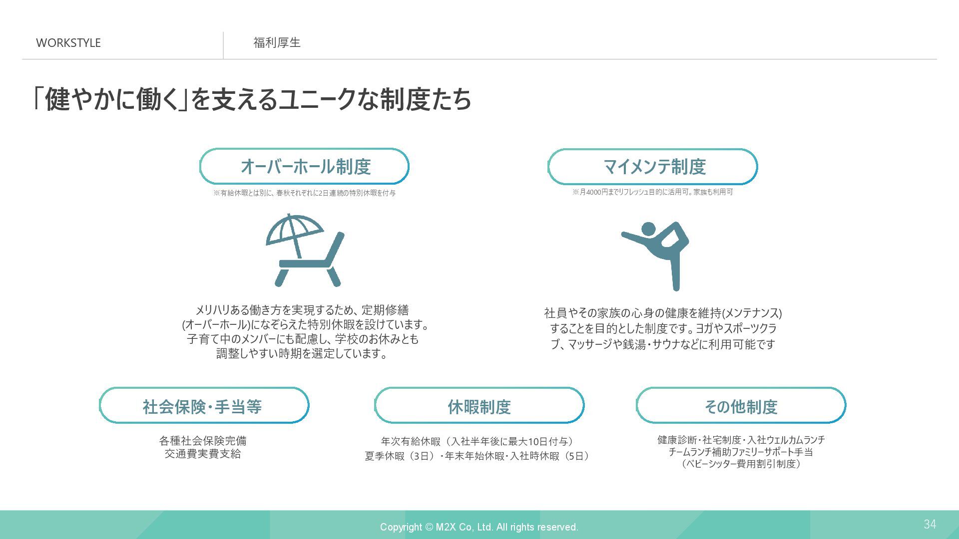 福利厚生 「健やかに働く」を支えるユニークな制度たち 各種社会保険完備 交通費実費支給 社会保険・手当等 健康診断・社宅制度・入社ウェルカムランチ チームランチ補助ファミリーサポート手当 (ベビーシッター費用割引制度) その他制度 オーバーホール制度 メリハリある働き方を実現するため、定期修繕 (オーバーホール)になぞらえた特別休暇を設けています。 子育て中のメンバーにも配慮し、学校のお休みとも 調整しやすい時期を選定しています。 マイメンテ制度 社員やその家族の心身の健康を維持(メンテナンス) することを目的とした制度です。ヨガやスポーツクラ ブ、マッサージや銭湯・サウナなどに利用可能です ※有給休暇とは別に、春秋それぞれに2日連続の特別休暇を付与 ※月4000円までリフレッシュ目的に活用可。家族も利用可 年次有給休暇(入社半年後に最大10日付与) 夏季休暇(3日)・年末年始休暇・入社時休暇(5日) 休暇制度