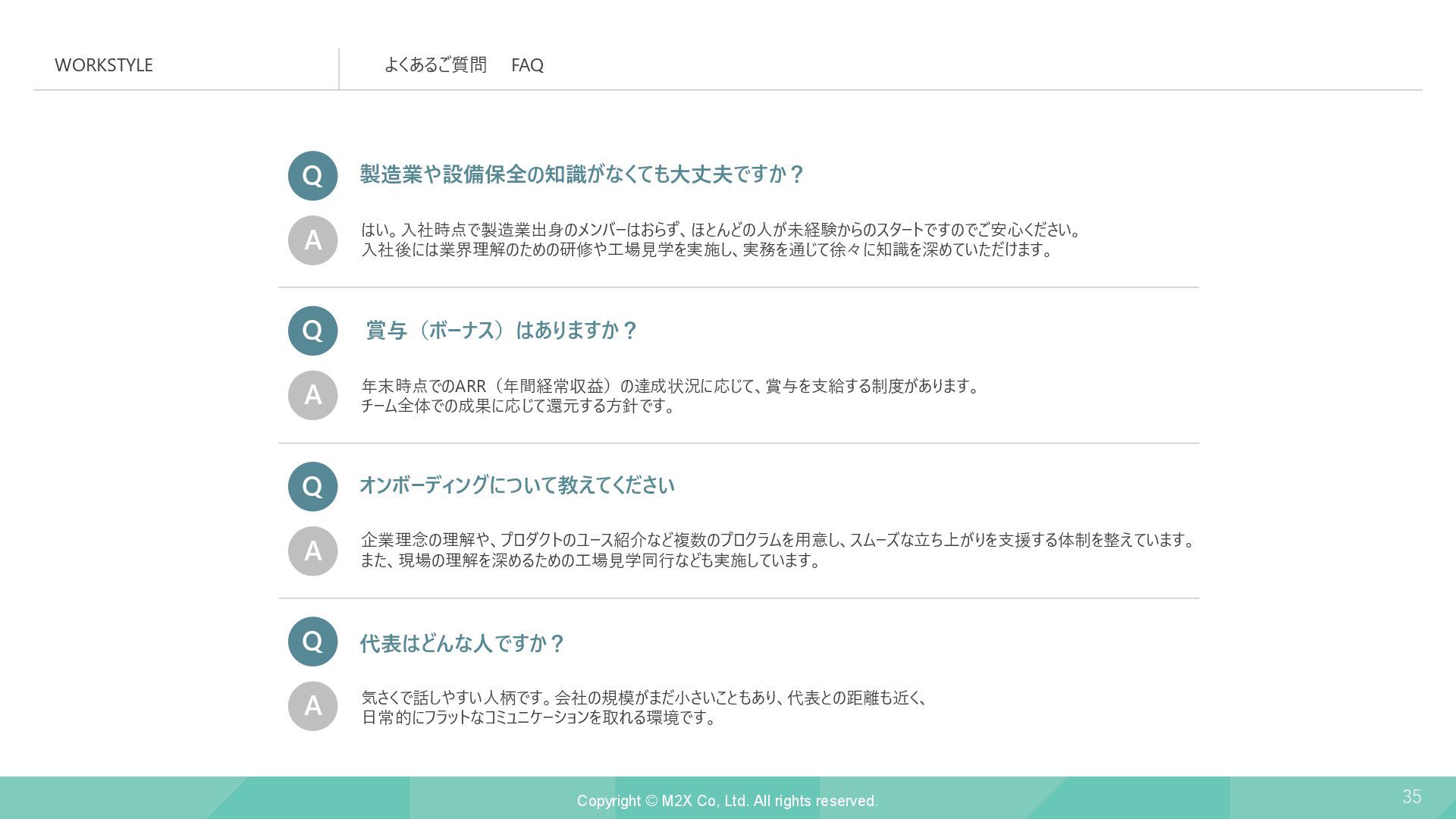 Copyright © M2X Co, Ltd. All rights reserved. 製造業や設備保全の知識がなくても大丈夫ですか? はい。入社時点で製造業出身のメンバーはおらず、ほとんどの人が未経験からのスタートですのでご安心ください。