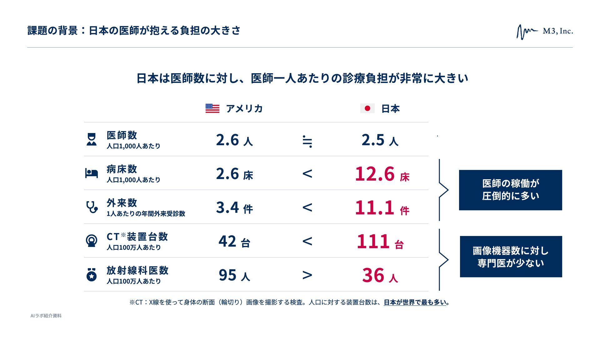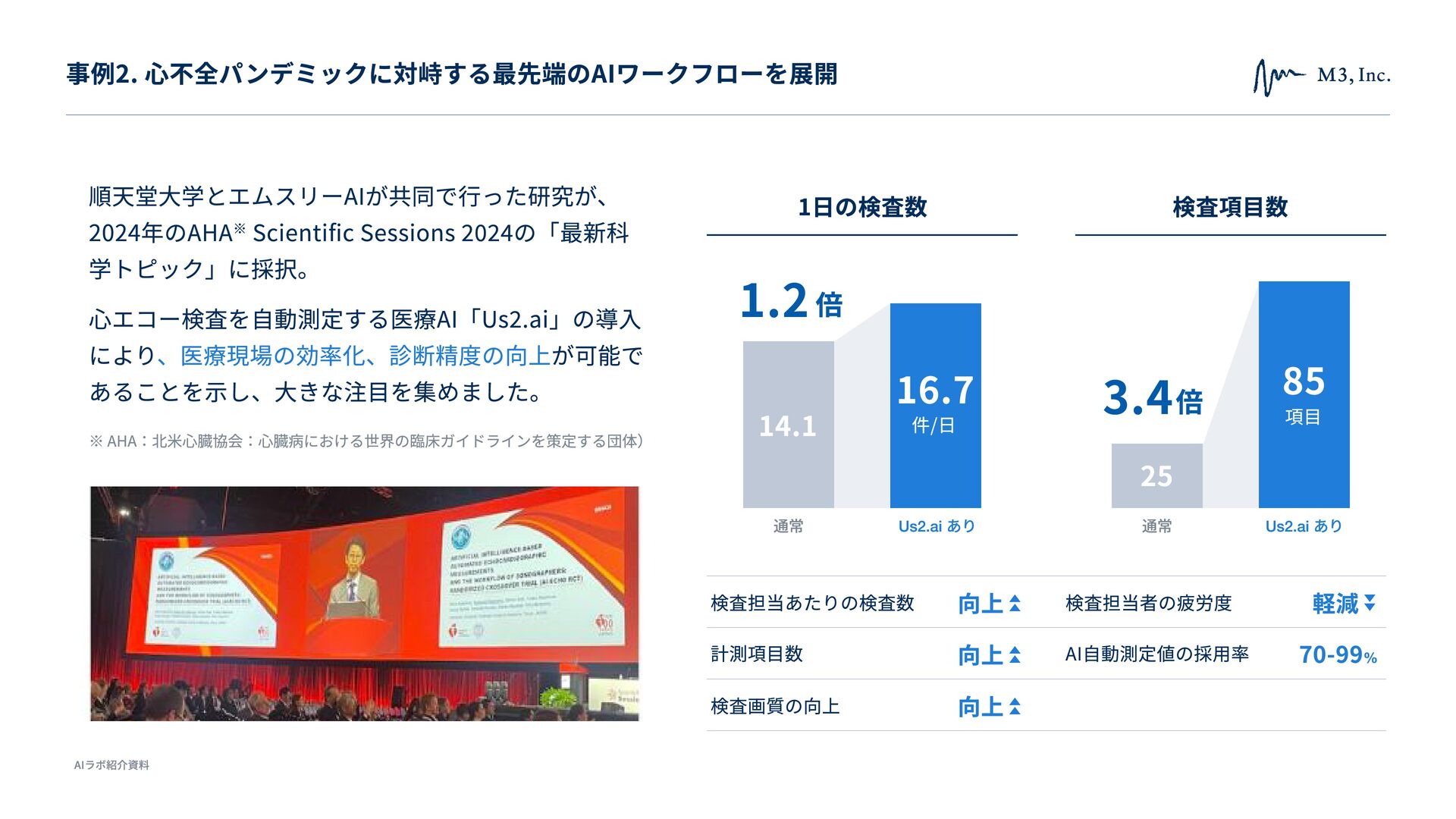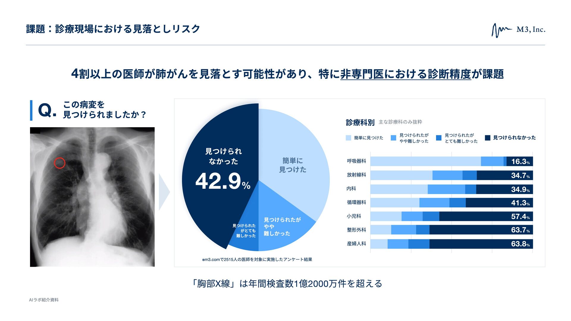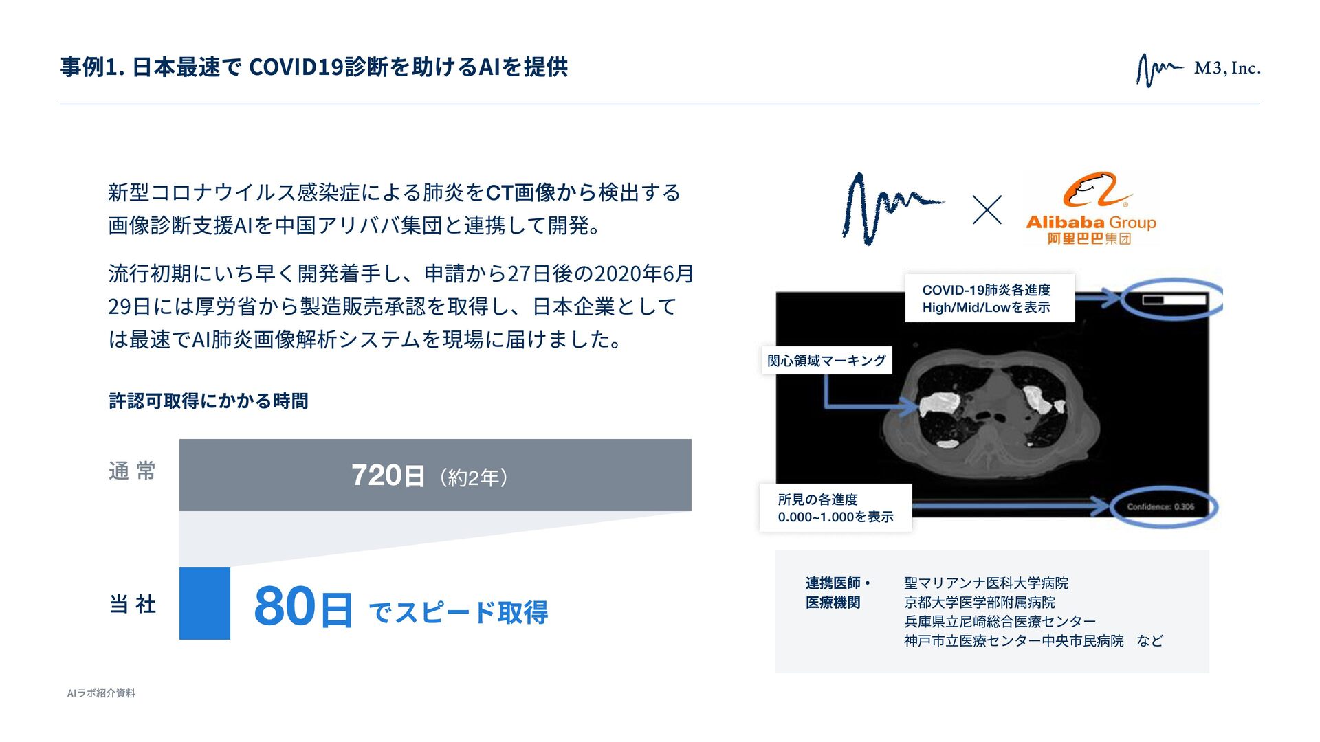 医療機器として認可を取得。日本発のプロ ダクトとして世界で注目を集めました。 ※ 製薬企業 日本ベーリンガーインゲルハイム かかりつけ医 呼吸器専門医 “線維化を伴う間質性肺疾患”の疑い 15万人 診断/治療 1.5万人 HRCT検査 呼吸機能検査 問診・身体所見 血液検査 胸部X線 日常的な検査での発見を支援し、 専門家による早期診断・治療へ繋げる 出典:疑い患者数と診断数:信州医誌, 60(2):98, 2012.「間質性肺疾患は、患者数は10万人あたり約10〜20人ですが、未診断の早期病変の潜在的患者数はその10倍以上とも推測される」という記載から疑い患者数を算出。診断済み患者数 については、特発性間質性肺炎の0話元年ど医療受給者証保持者数を記載。 診断フロー:日本呼吸器学会びまん性肺疾患診断・治療ガイドライン作成委員会編:特発性間質性肺炎 診断と治療の手引き2022; 改訂第4班 p.168-169, 2922 南江堂より一部修正 確信度スコアを表示