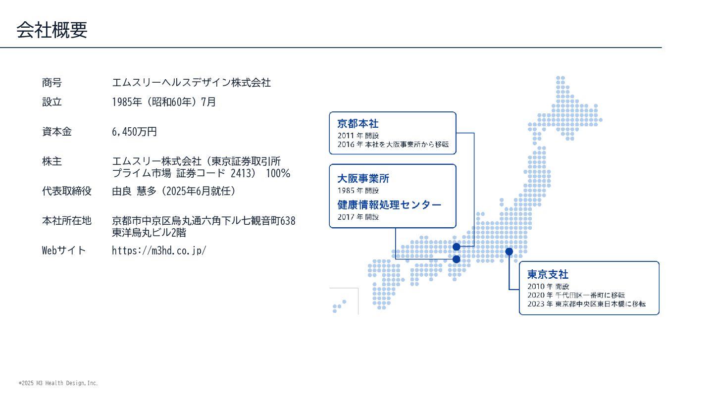 6,450万円 株主 エムスリー株式会社(東京証券取引所 プライム市場 証券コード 2413) 100% 代表取締役 由良 慧多(2025年6月就任) 本社所在地 京都市中京区烏丸通六角下ル七観音町638 東洋烏丸ビル2階 Webサイト https://m3hd.co.jp/