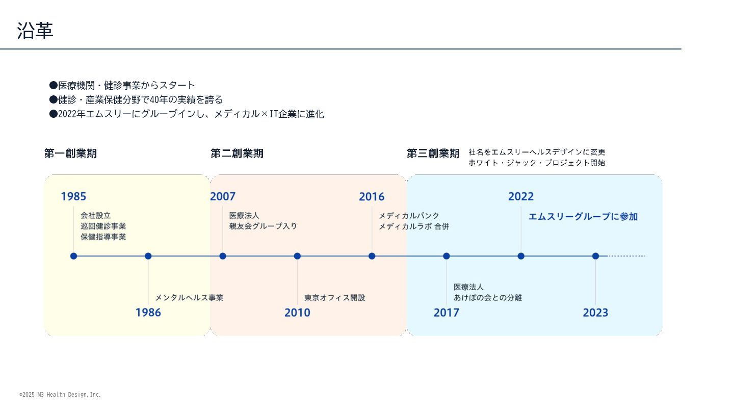 ©︎2025 M3 Health Design,Inc. 沿革 •医療機関・健診事業からスタート •健診・産業保健分野で40年の実績を誇る •2022年エムスリーにグループインし、メディカル×IT企業に進化