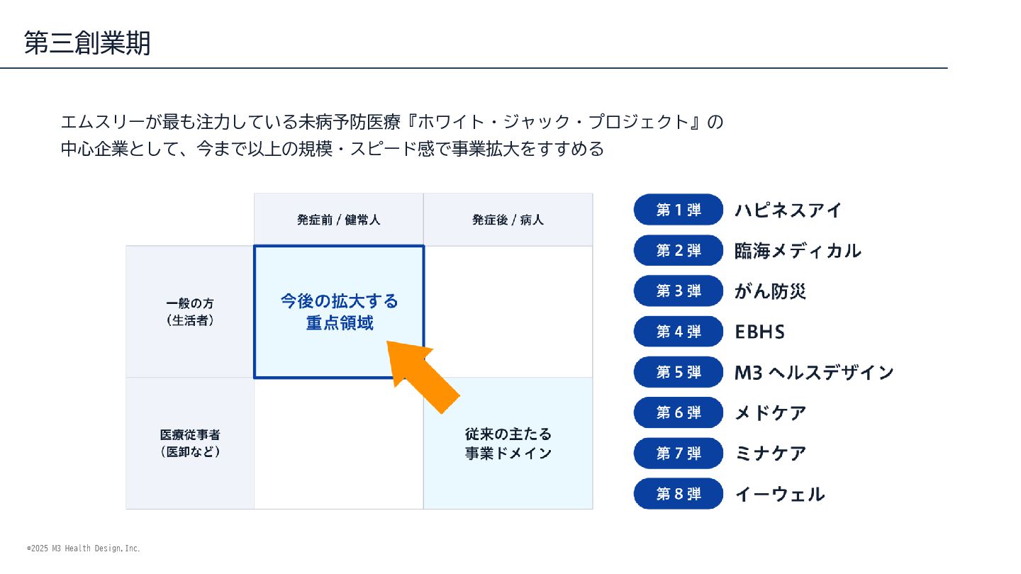 ©︎2025 M3 Health Design,Inc. 第三創業期 エムスリーが最も注力している未病予防医療『ホワイト・ジャック・プロジェクト』の 中心企業として、今まで以上の規模・スピード感で事業拡大をすすめる