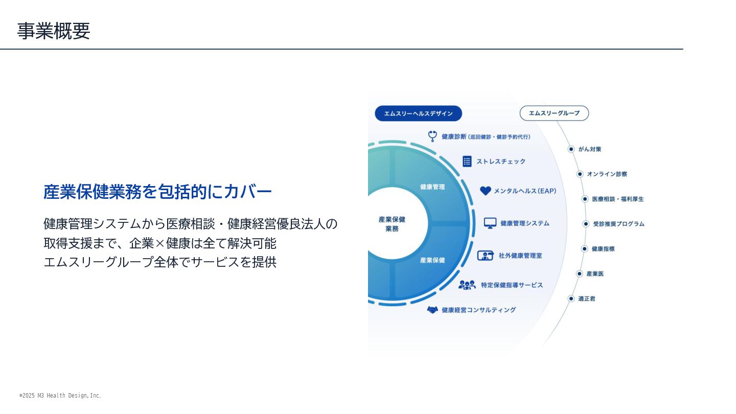 ©︎2025 M3 Health Design,Inc. 事業概要 産業保健業務を包括的にカバー 健康管理システムから医療相談・健康経営優良法人の 取得支援まで、企業×健康は全て解決可能 エムスリーグループ全体でサービスを提供