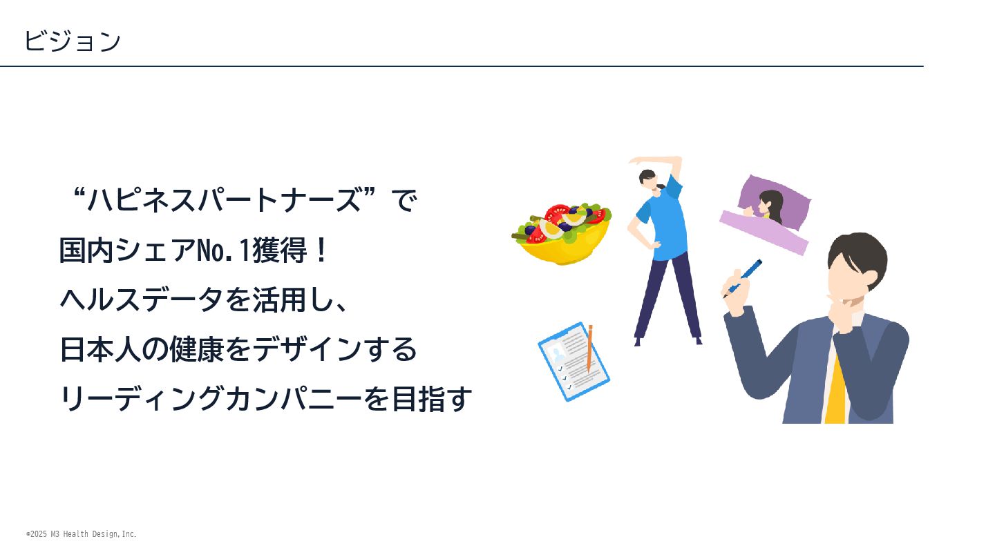 ©︎2025 M3 Health Design,Inc. ビジョン “ハピネスパートナーズ”で 国内シェアNo.1獲得! ヘルスデータを活用し、 日本人の健康をデザインする リーディングカンパニーを目指す