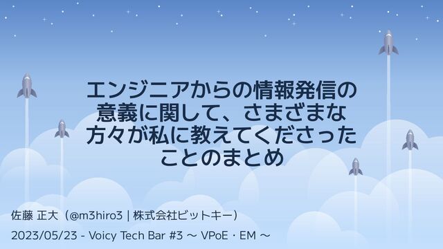 エンジニアからの情報発信の 意義に関して、さまざまな 方々が私に教えてくださった ことのまとめ 佐藤 正大(@m3hiro3 | 株式会社ビットキー) 2023/05/23 -