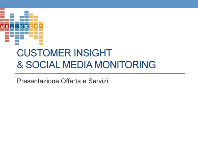 eccellenza a supporto delle decisioni di business del social crm attraverso le migliori piattaforme sul mercato. Social Intelligence Customer Insight Brand Reputation Competitor Analysis Crisis Mgmnt Customer Profiling Media Mapping Analisi Storica delle opinioni dei clienti sui social network e sul web Come si parla online del brand (non solo degli aspetti di servizio Ascolto di tutti i competitor sui diversi assi (offerta, servizio, innovazione, prodotto) Prevenzione delle crisi con Alert in real time al verificarsi di eventi in rete Nuove segmentazioni e social network analyisis per costruire nuove logiche di profilazione Individuazione degli influencer (siti e persone) in riferimento al brand Servizi di Social Intelligence WeLikeCRM