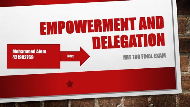 interchangeably, there are several areas of difference between them. Delegation is a straightforward means of assigning tasks to your employees. Empowerment seeks to give an employee more authority with the aim of developing employee commitment, enthusiasm and expertise, while encouraging innovation that will benefit the organization over time. Empowerment necessarily requires some level of delegation, but not all instances of delegation will produce an empowered employee. Delegation Empowerment Normally refers to the assignment of a task. It is work-focused May involve non-work activities, emotions, and relationships. It involves the way people think about themselves Home 18/05/2022 MOHAMMED ALEM 5