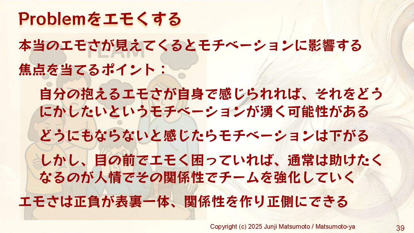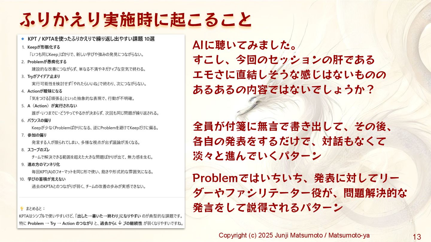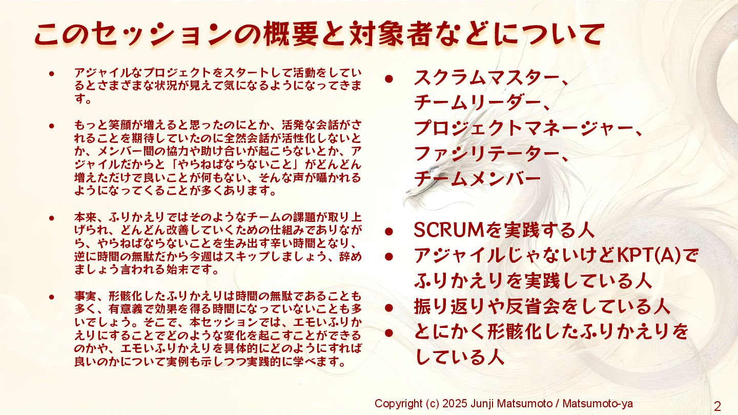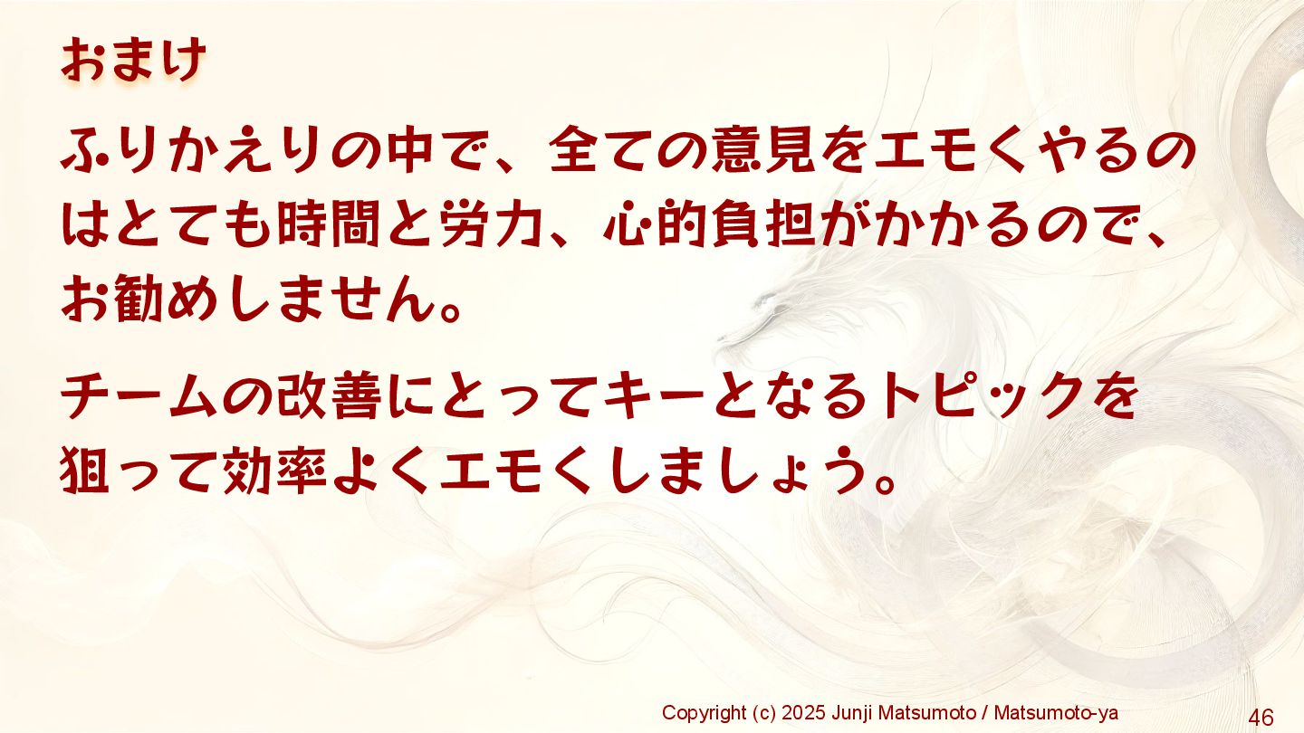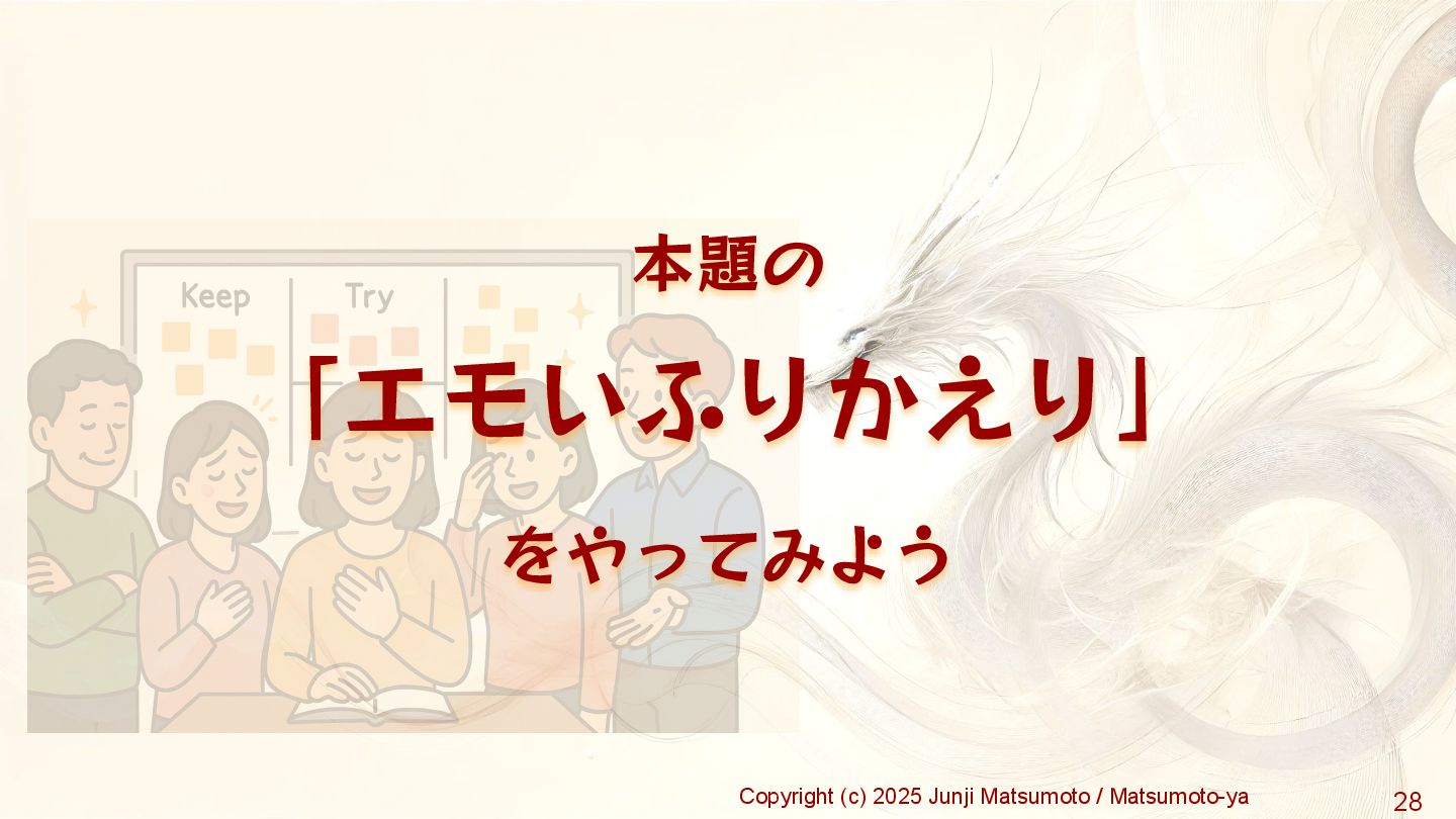 事実、形骸化したふりかえりは時間の無駄であることも多く、有意義で効果を得る時間になっていないことも多いでしょう。そこで、本セッションでは、エモいふりかえりにすることでどのような変化を起こすことができるのかや、エモいふりかえりを具体的にどのようにすれば良いのかについて実例も示しつつ実践的に学べます。