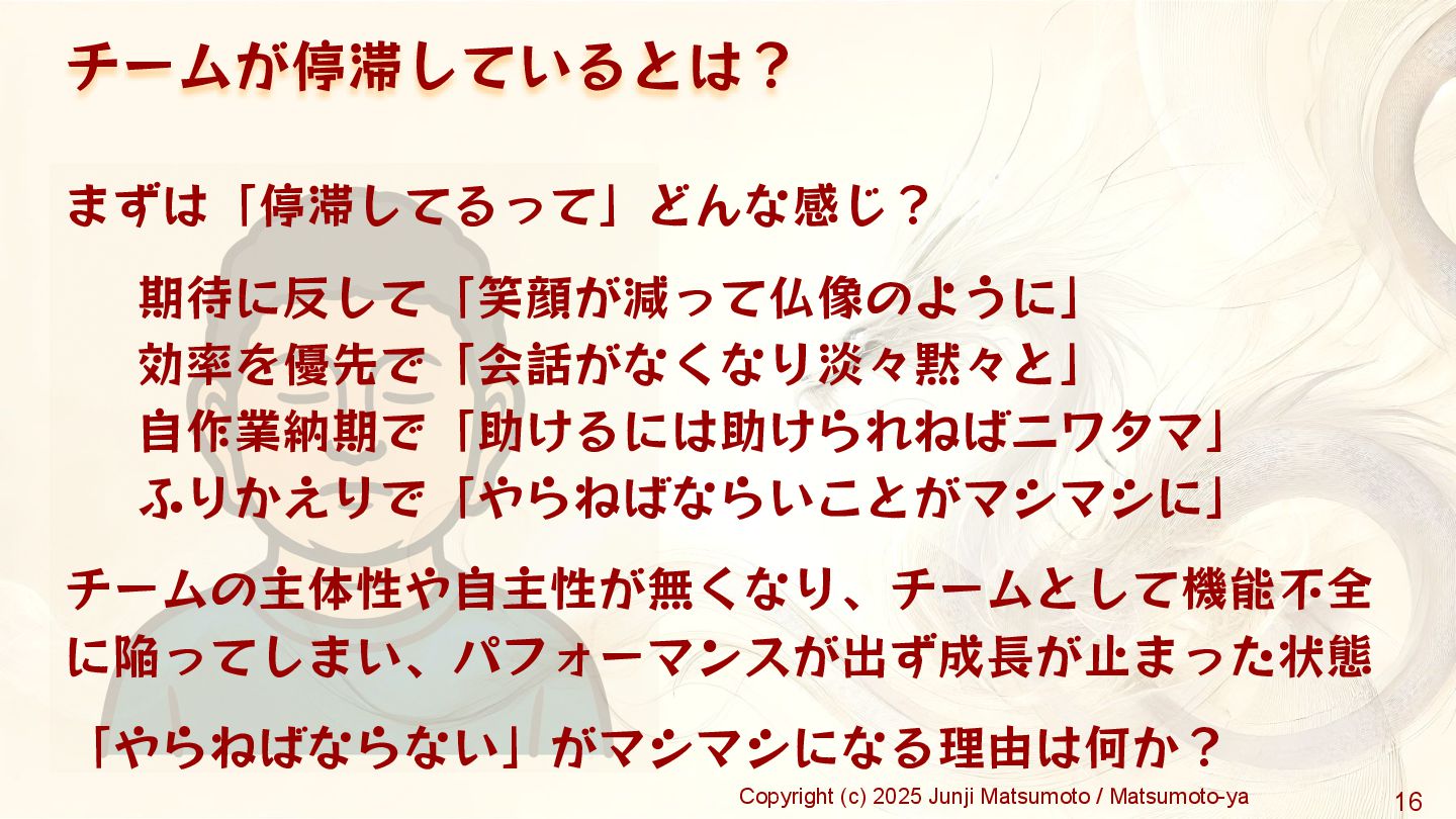 もっと笑顔が増えると思ったのにとか、活発な会話がされることを期待していたのに全然会話が活性化しないとか、メンバー間の協力や助け合いが起こらないとか、アジャイルだからと「やらねばならないこと」がどんどん増えただけで良いことが何もない、そんな声が囁かれるようになってくることが多くあります。
