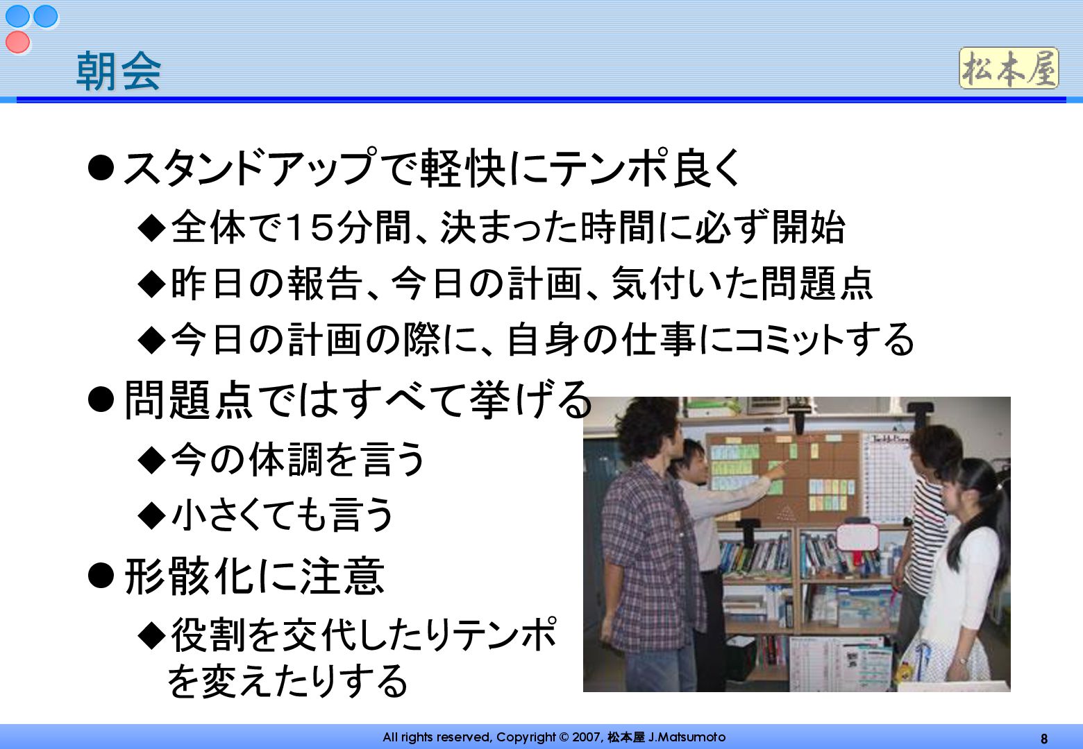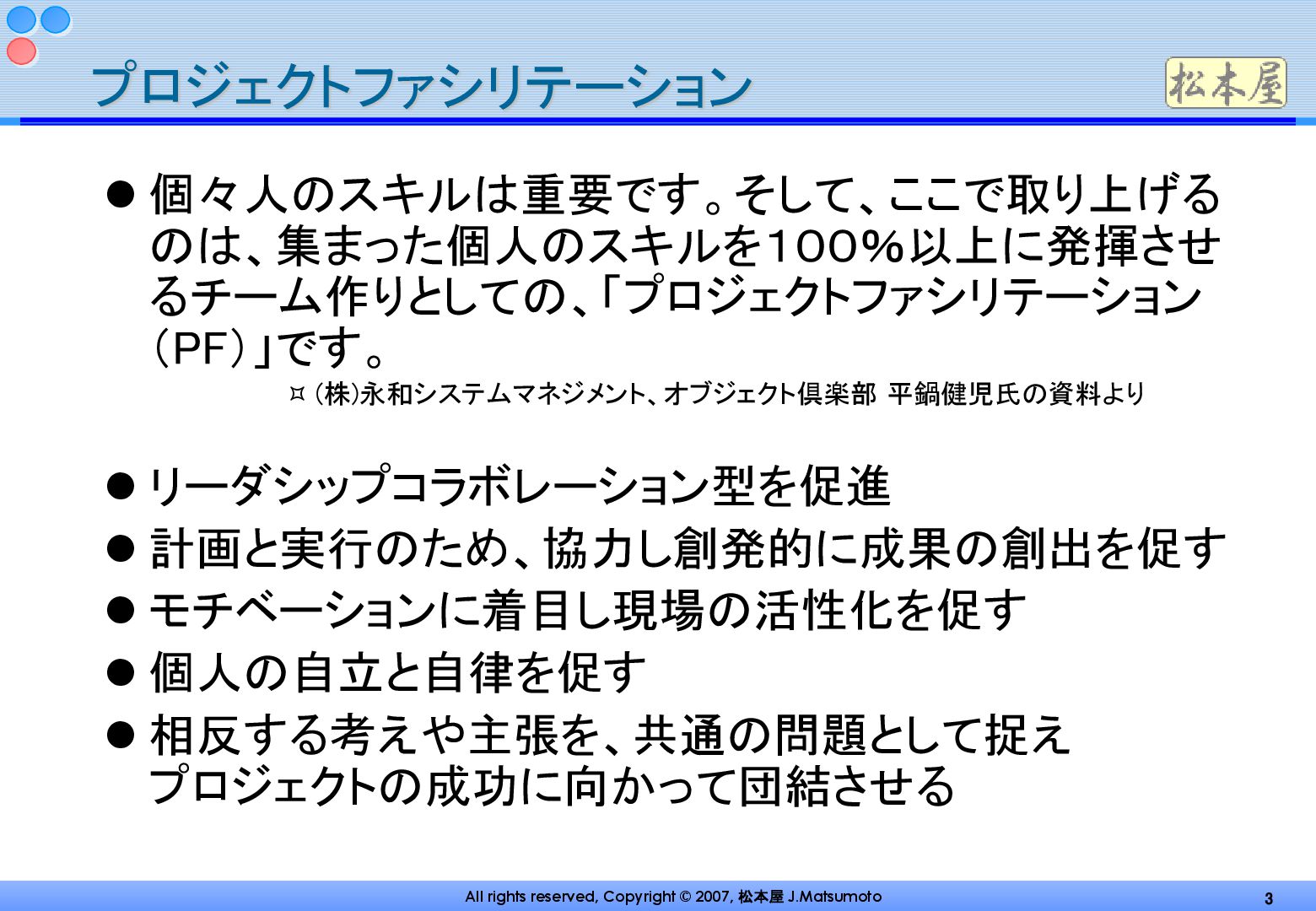 この資料は、プロジェクトファシリテーション(PF)の実践に焦点を当てたものであり、PMシンポジウム2007で松本潤二氏によって発表されました。PFは、個々人のスキルを集約してチームの成果を100%以上に引き上げることを目指し、リーダーシップコラボレーション型を促進すると定義されています。資料では、作業かんばん、計画ゲーム、朝会、ペアワーク、バーンダウンチャート、にこにこカレンダー、振り返り(KPT)といった具体的な手法と事例を紹介し、現場力の向上とモチベーションの活性化を図る方法を解説しています。最終的には、柔軟な対応や自己変革の重要性を強調し、プロジェクト成功に向けたメンバーの自律的な行動を促すアプローチが示されています。