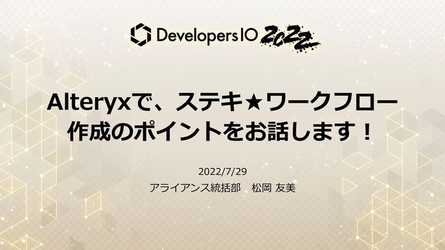 Alteryxで、ステキ★ワークフロー 作成のポイントをお話します! 2022/7/29 アライアンス統括部 松岡 友美