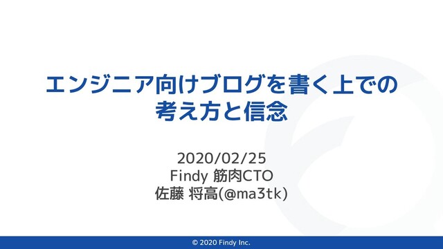 © 2020 Findy Inc. エンジニア向けブログを書く上での 考え方と信念 2020/02/25 Findy 筋肉CTO 佐藤