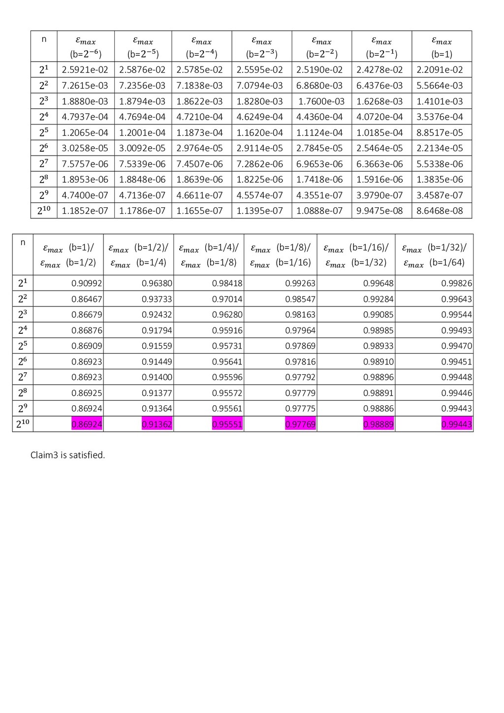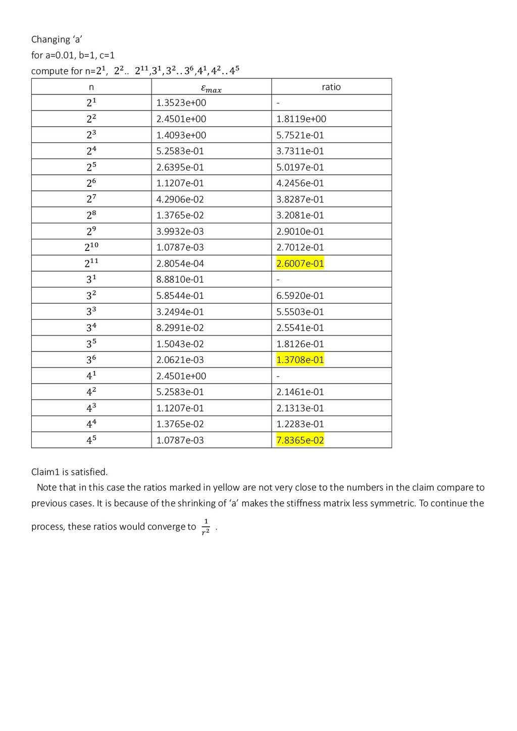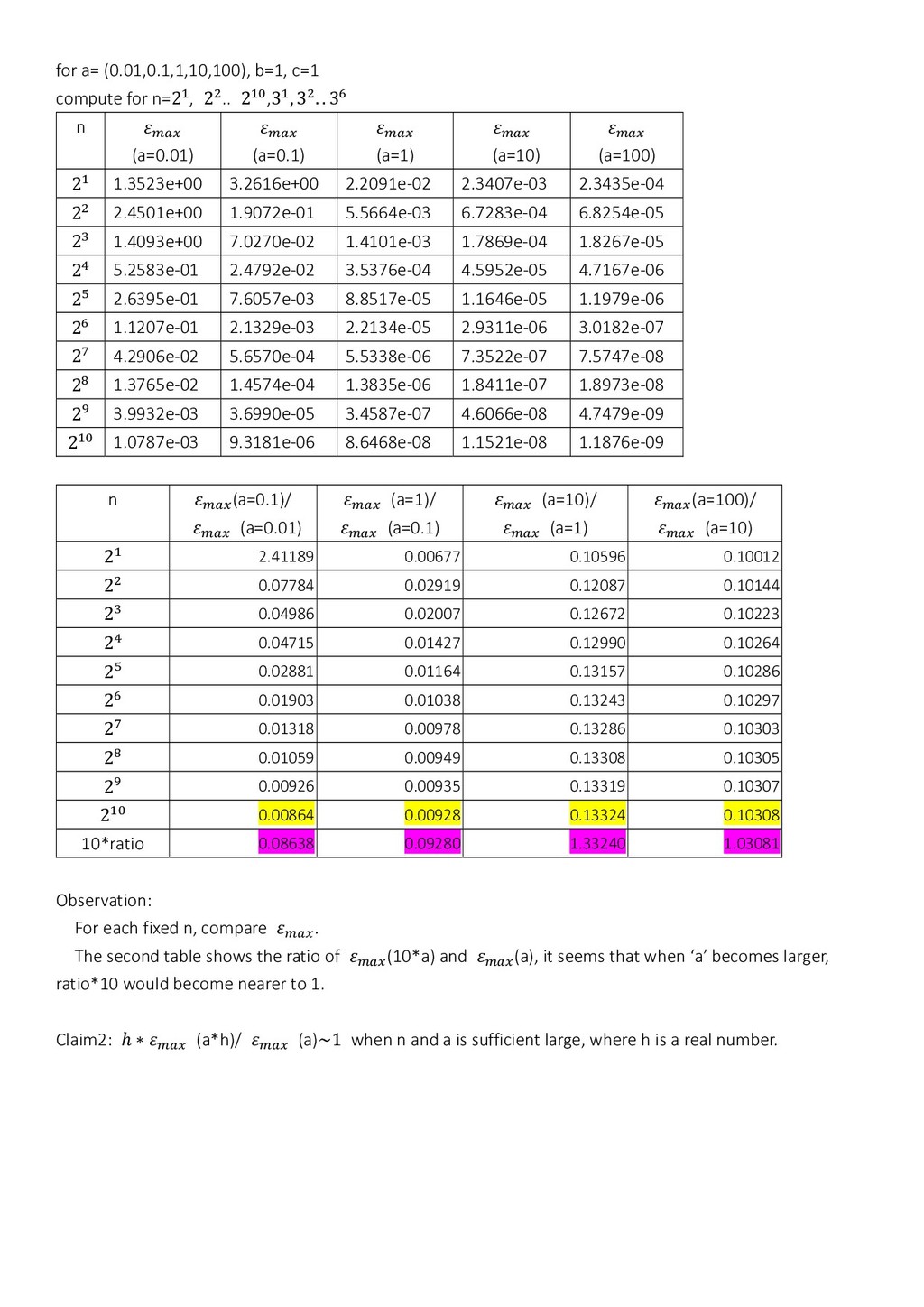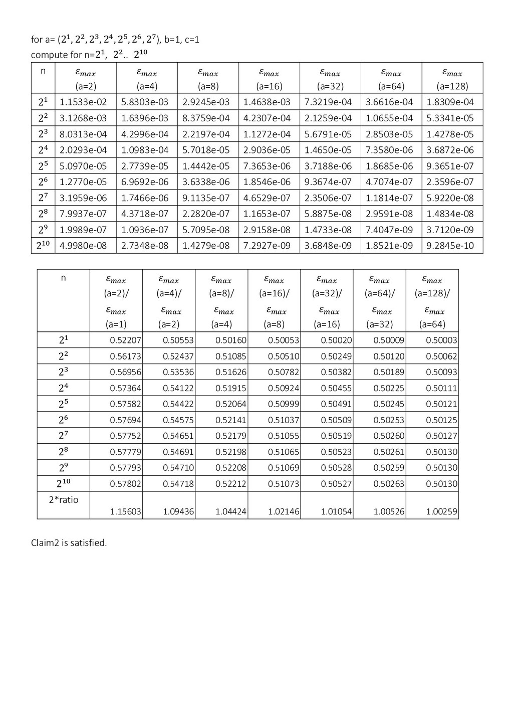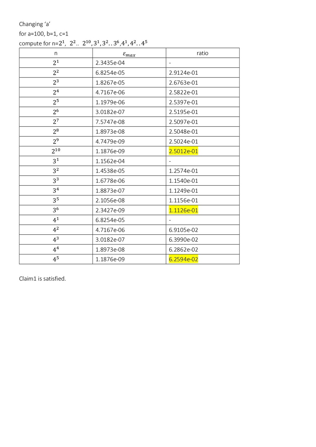 and changing n. 2. a=(1,2 , 2 ,2 , 2 , 2 ), b=1, c=1, and changing n. 3. a=1, b= (0.01,0.1,1,10,100), c=1, and changing n. 4. a=1, b= (1,2 , 2 ,2 , 2 , 2 ), c=1, and changing n. DATAS: for a=1, b=1, c=1 compute for n=2 , 2 .. 2 , 3 , 3 . . 3 ,4 , 4 . . 4 n ratio 2 2.2091e-02 - 2 5.5664e-03 2.5197e-01 2 1.4101e-03 2.5332e-01 2 3.5376e-04 2.5087e-01 2 8.8517e-05 2.5022e-01 2 2.2134e-05 2.5005e-01 2 5.5338e-06 2.5001e-01 2 1.3835e-06 2.5000e-01 2 3.4587e-07 2.5000e-01 2 8.6468e-08 2.5000e-01 3 9.9214e-03 - 3 1.1170e-03 1.1259e-01 3 1.2435e-04 1.1132e-01 3 1.3819e-05 1.1113e-01 3 1.5355e-06 1.1111e-01 3 1.7061e-07 1.1111e-01 4 5.5664e-03 - 4 3.5376e-04 6.3553e-02 4 2.2134e-05 6.2567e-02 4 1.3835e-06 6.2506e-02 4 8.6468e-08 6.2499e-02 Observation: 2.5000e-01=0.25= 1.1111e-01=0.1111= 6.2499e-02=0.062499≅ 0.0625= Claim1: (n*r)/ (n)~ for n is sufficient large.
