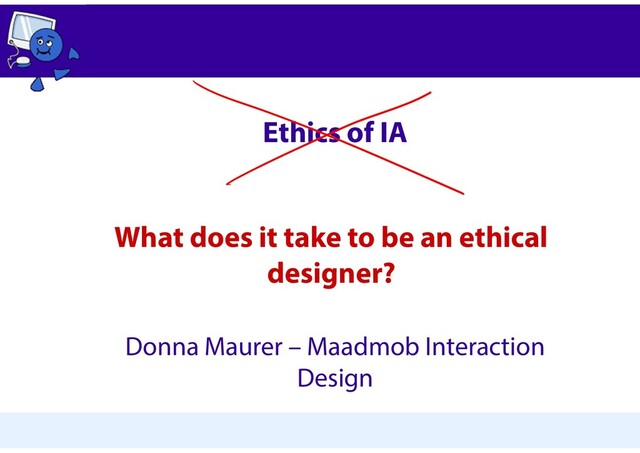 Information architecture affects people - there’s no doubt about that. And in any practice that affects people, a range of ethical issues come into play. Each and every decision we make can help or hurt many - our users, clients, peers and even our profession as a whole.This presentation will examine some of the ethical issues that we face as information architects, including: