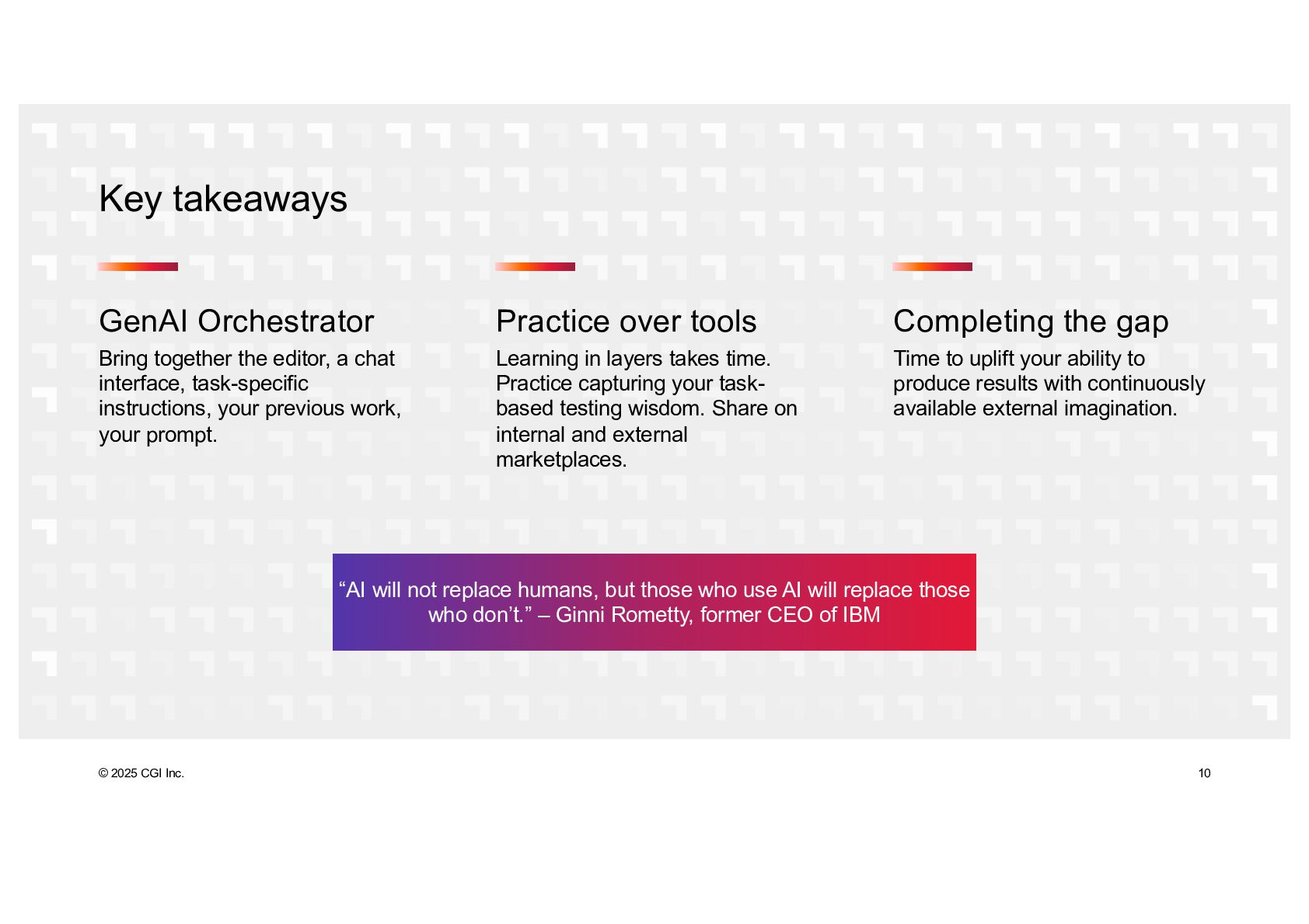together the editor, a chat interface, task-specific instructions, your previous work, your prompt. Practice over tools Learning in layers takes time. Practice capturing your task- based testing wisdom. Share on internal and external marketplaces. Completing the gap Time to uplift your ability to produce results with continuously available external imagination. “AI will not replace humans, but those who use AI will replace those who don’t.” – Ginni Rometty, former CEO of IBM