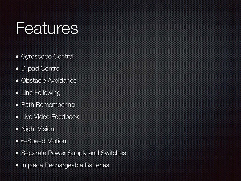 A vehicle controlled by an Android application using the gyroscope, wirelessly connected via Bluetooth; it has speed control, night vision, live video feedback received at the Android phone, obstacle avoidance, path finder, in-place rechargeable batteries and path record/replay. Designed to handle different kinds of indoor and outdoor applications and to explore areas that are difficult to reach.