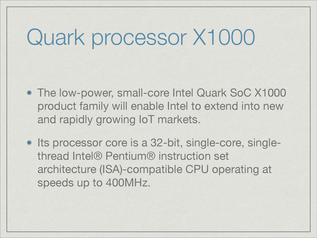 product family will enable Intel to extend into new and rapidly growing IoT markets. Its processor core is a 32-bit, single-core, single- thread Intel® Pentium® instruction set architecture (ISA)-compatible CPU operating at speeds up to 400MHz.