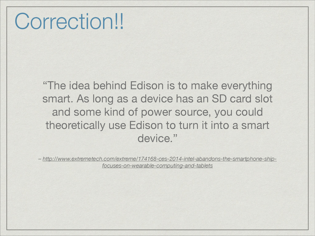 long as a device has an SD card slot and some kind of power source, you could theoretically use Edison to turn it into a smart device.” – http://www.extremetech.com/extreme/174168-ces-2014-intel-abandons-the-smartphone-ship- focuses-on-wearable-computing-and-tablets Correction!!