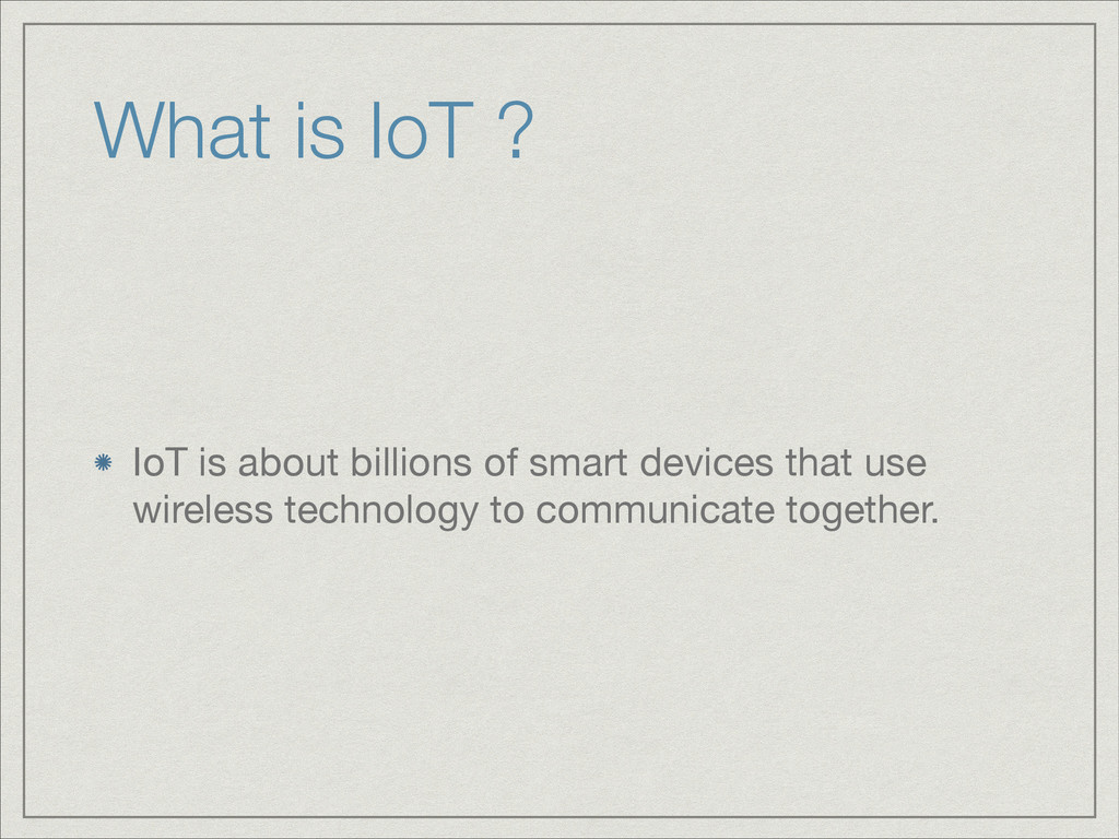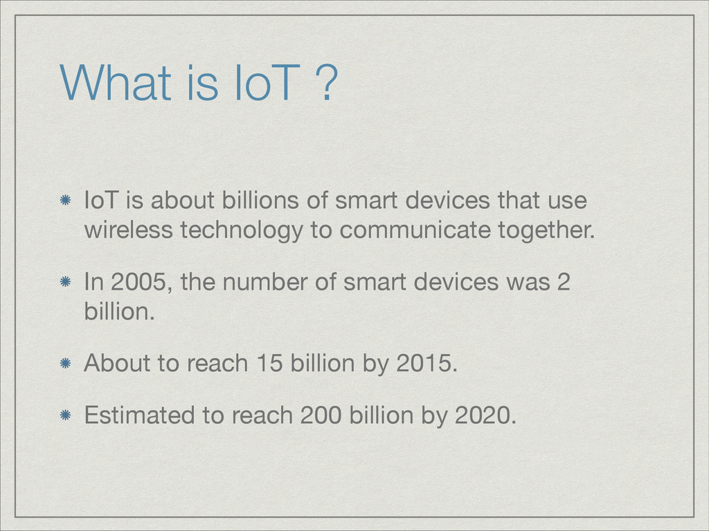 devices that use wireless technology to communicate together. In 2005, the number of smart devices was 2 billion. About to reach 15 billion by 2015. Estimated to reach 200 billion by 2020.