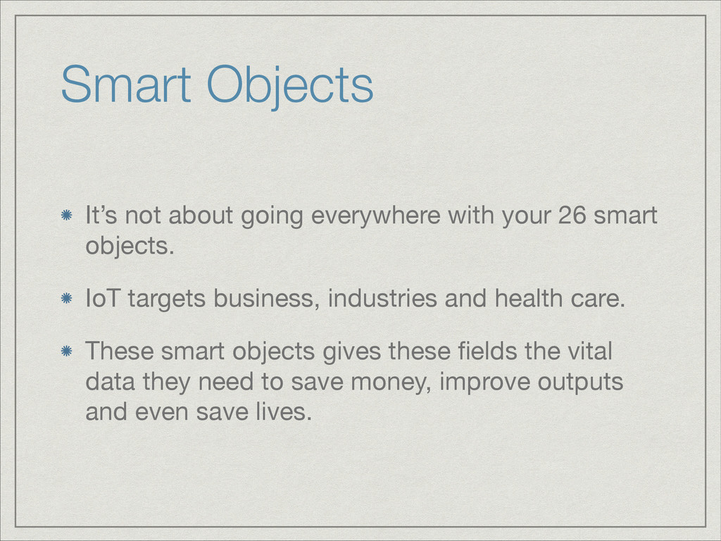 smart objects. IoT targets business, industries and health care. These smart objects gives these fields the vital data they need to save money, improve outputs and even save lives.