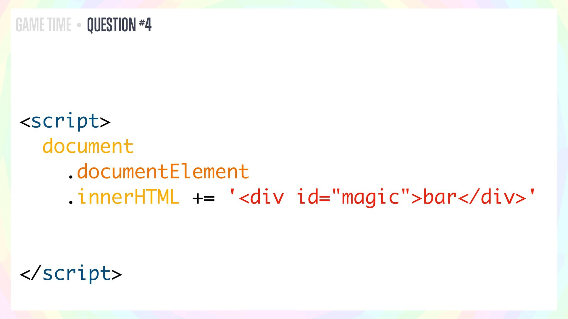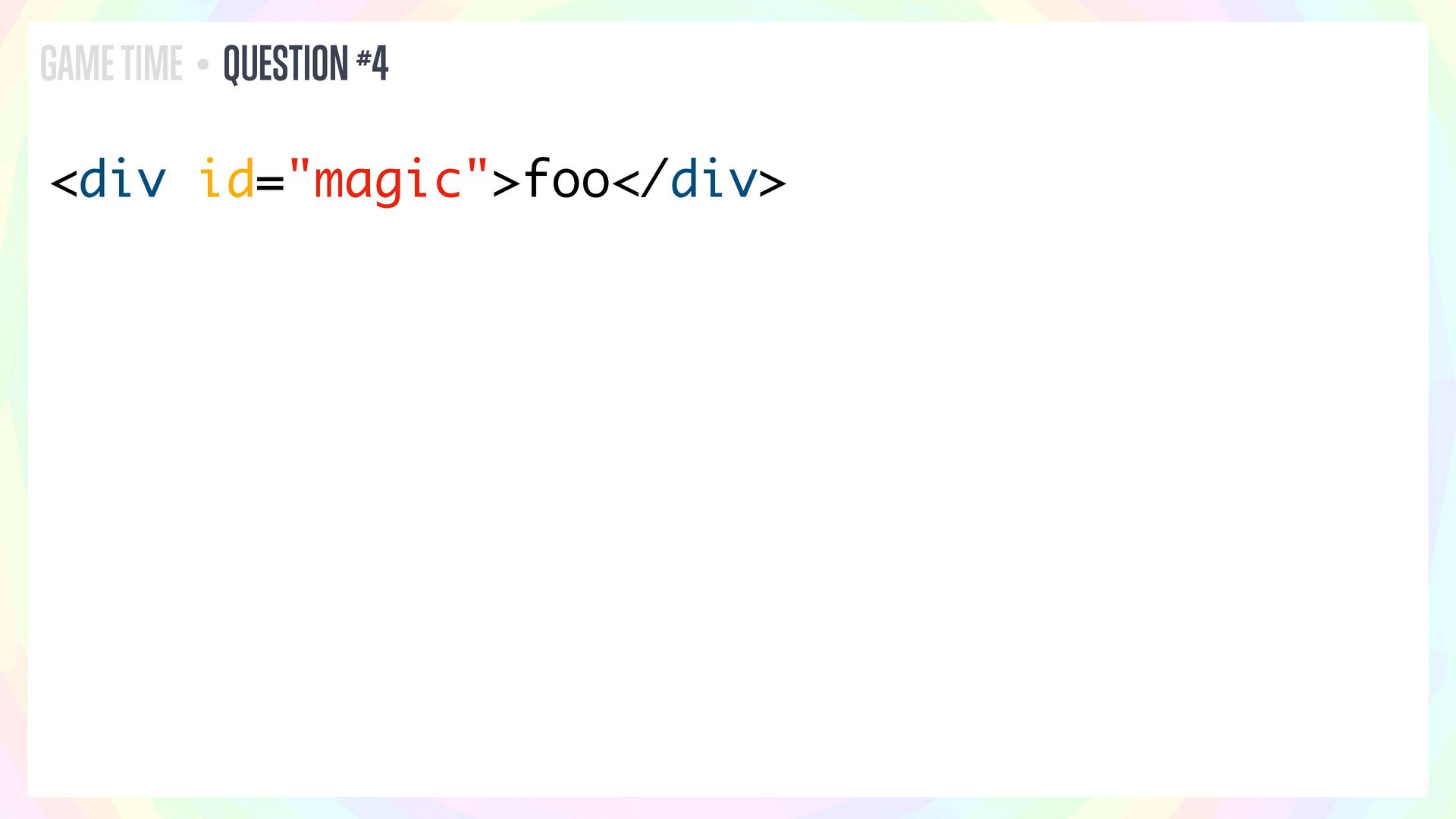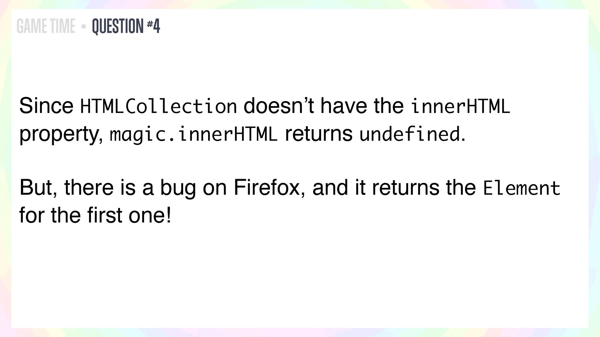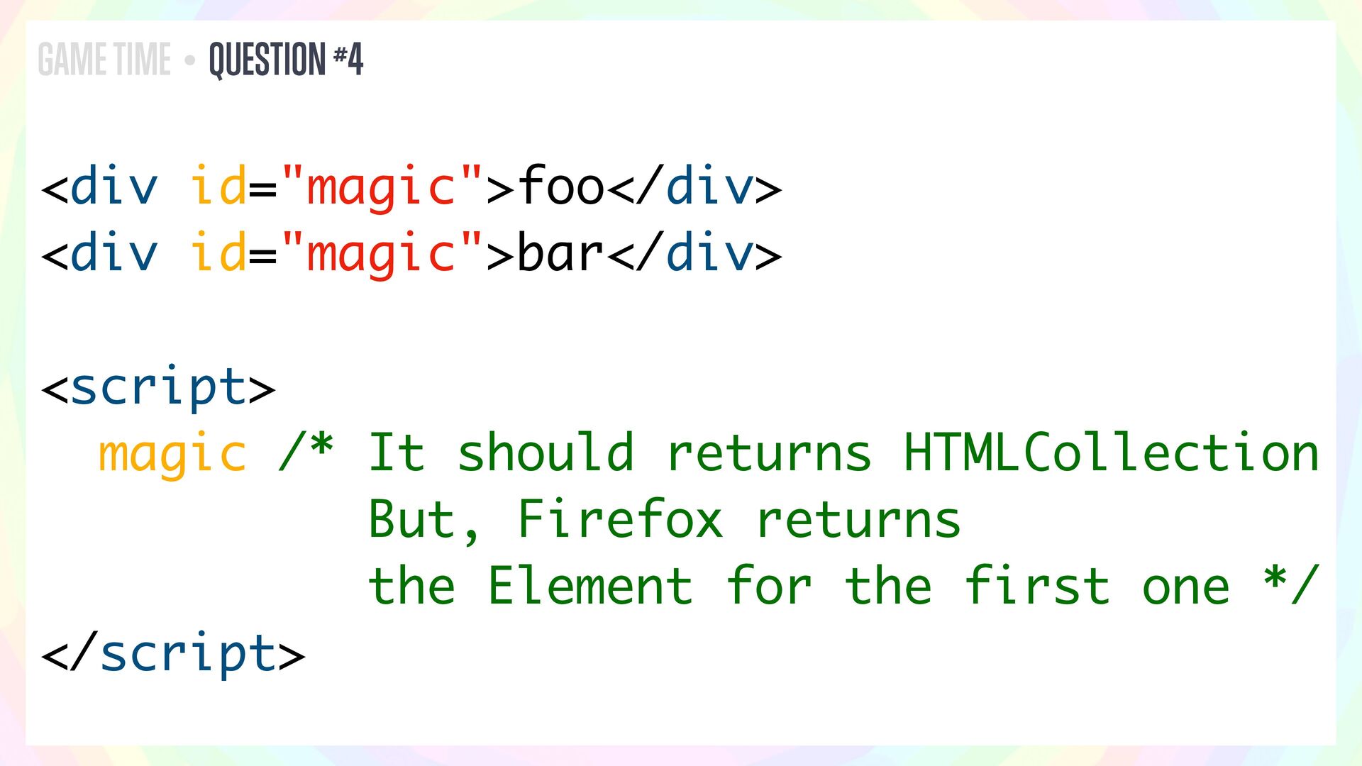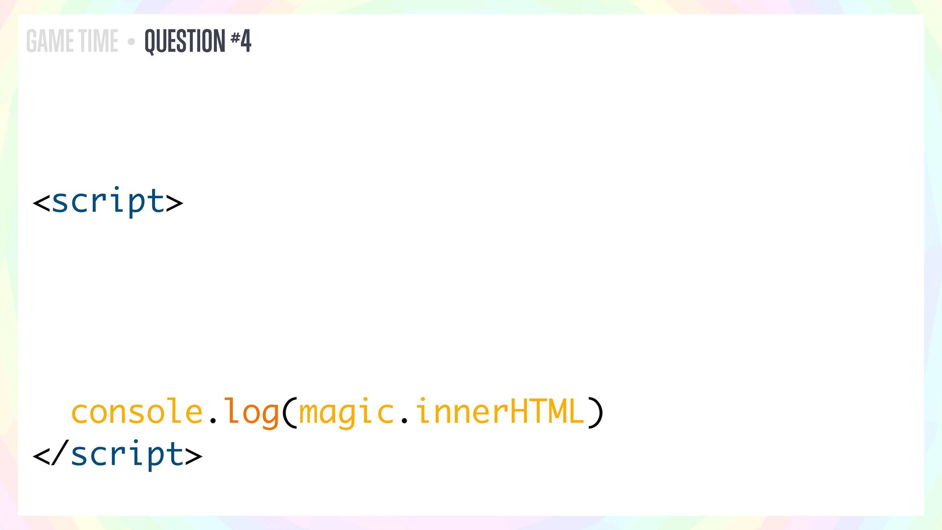 In this talk, I’ll present a series of JavaScript and HTML riddles full of mystery, and walk through each one step by step.