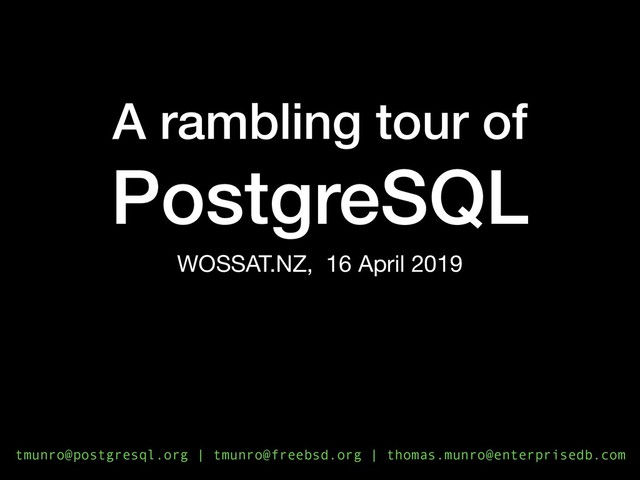 A talk given at WOSSAT.NZ on 16 April 2019. Information discussion of PostgreSQL history, the project, how to get involved, and selected features I like.
