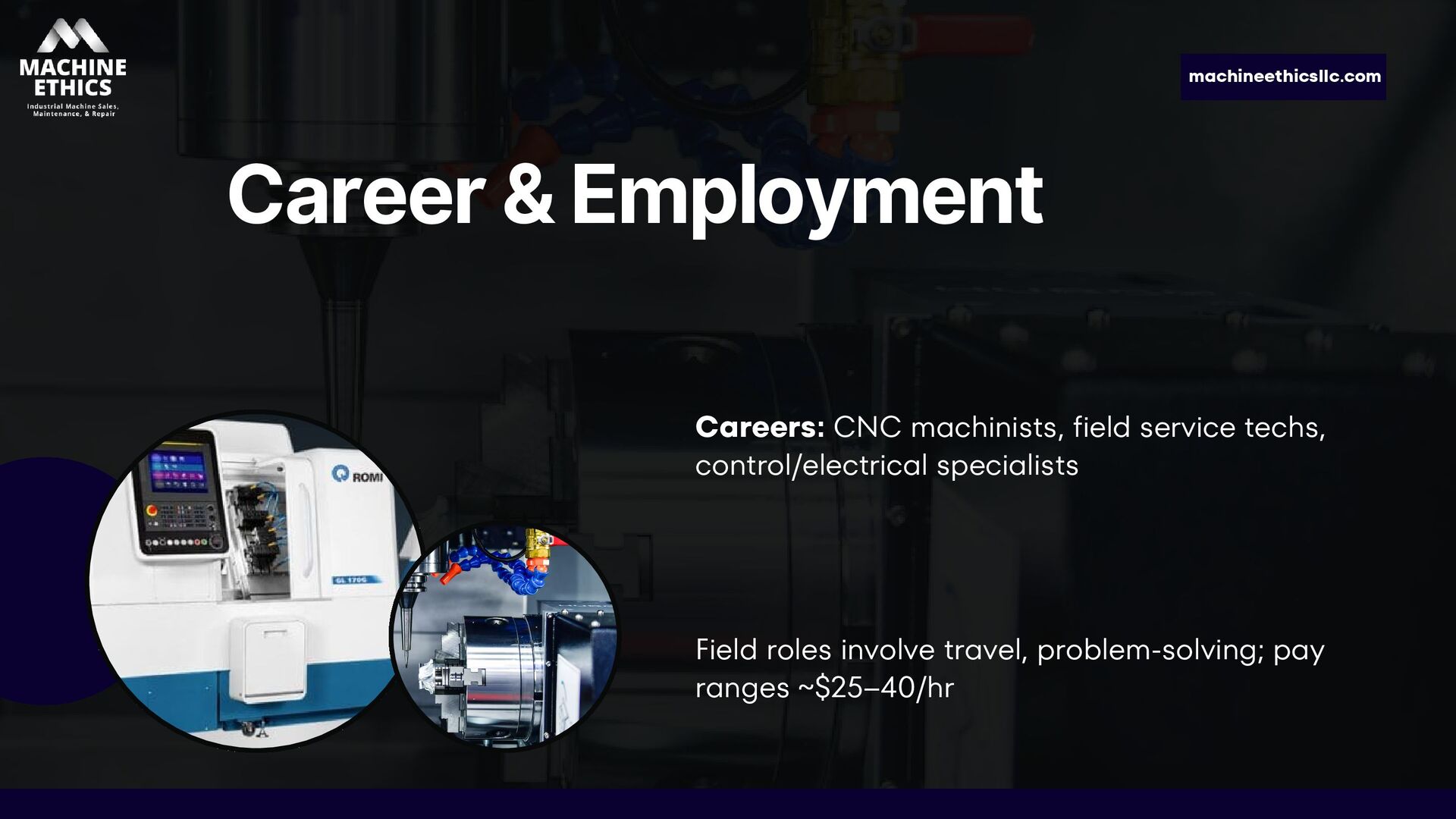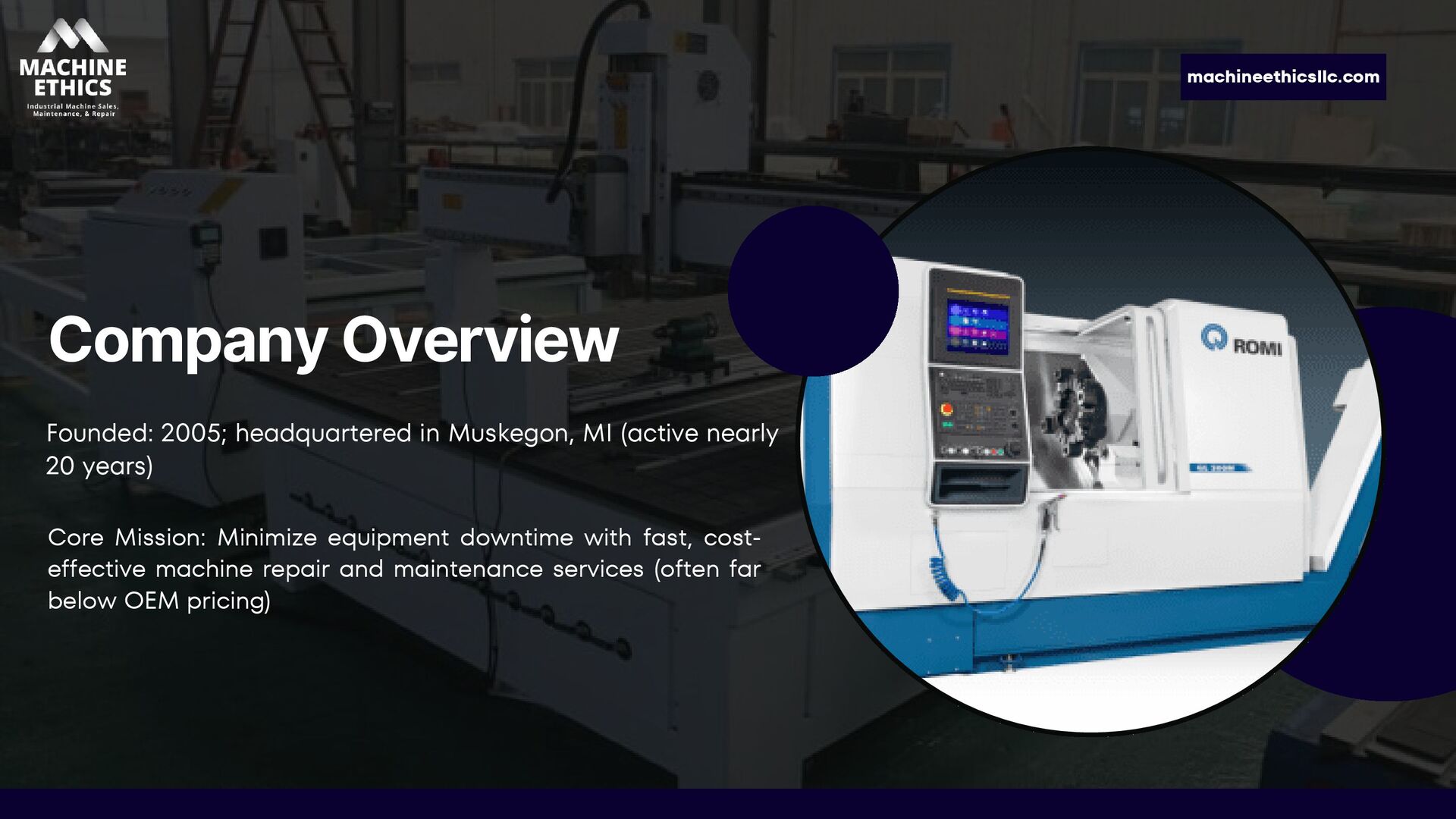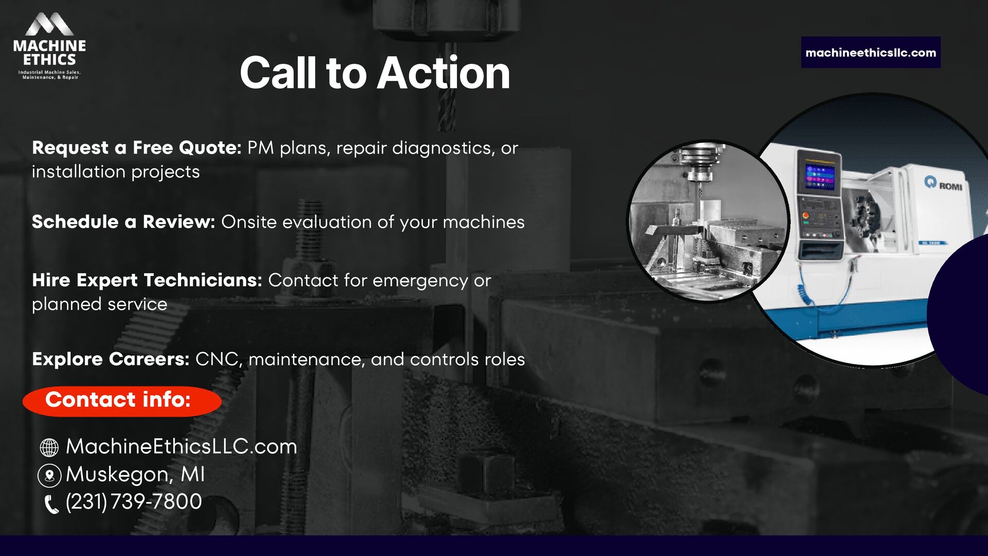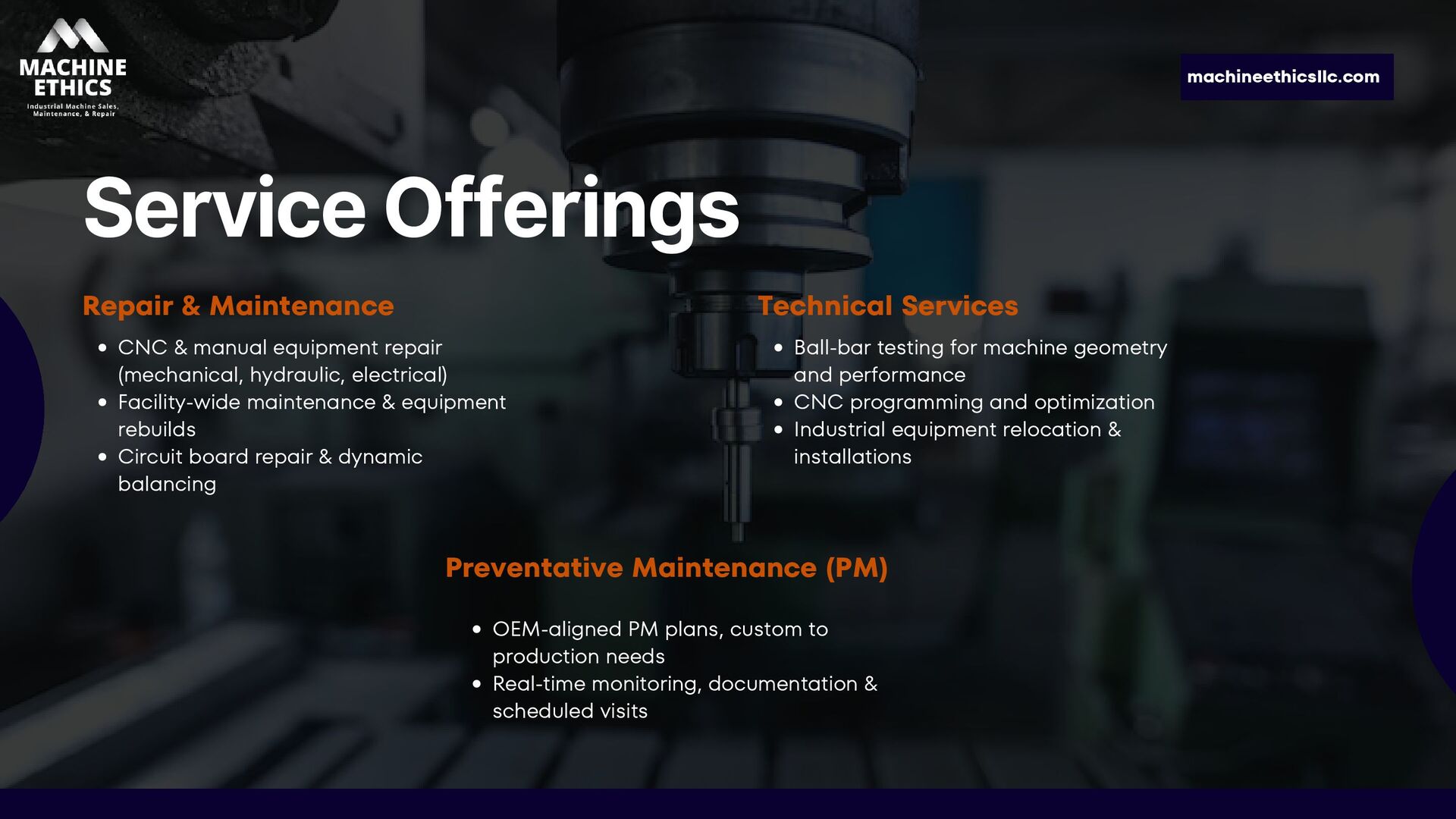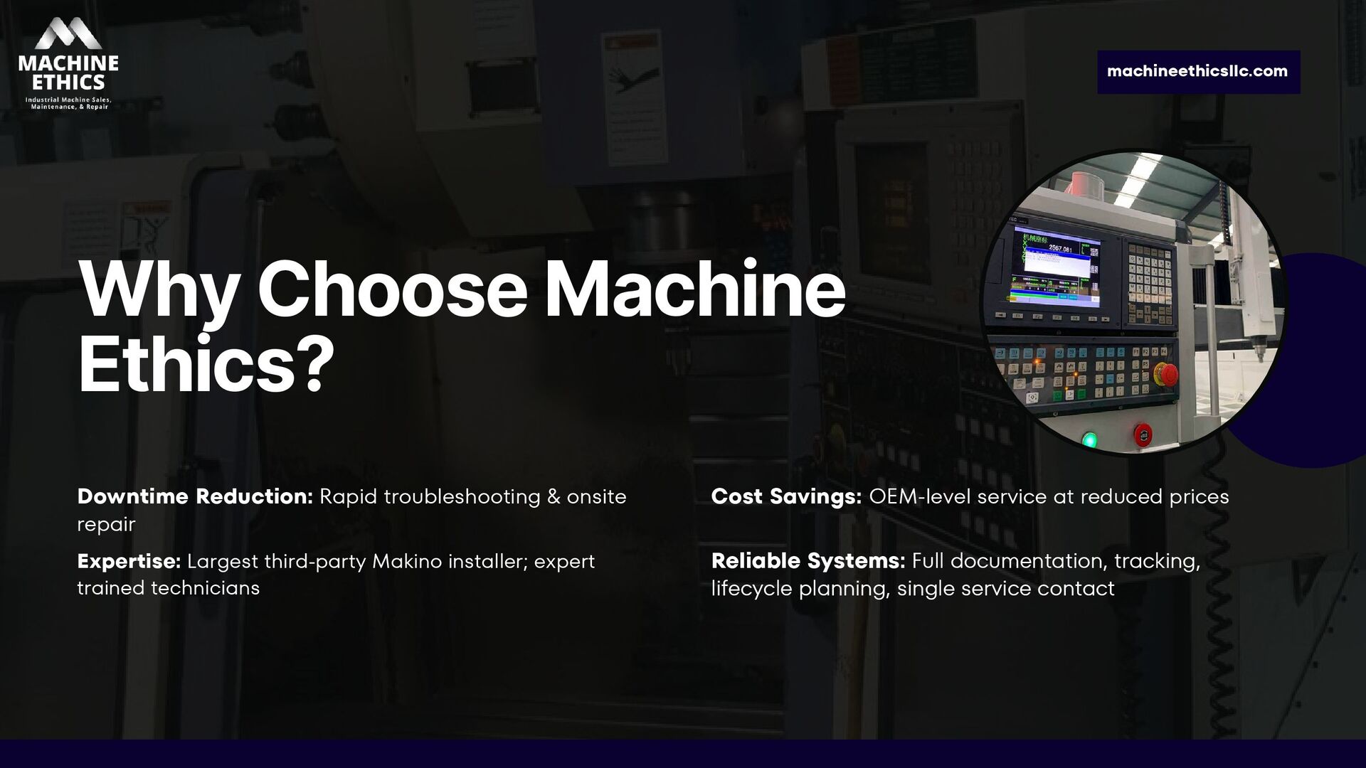 Machine Ethics LLC is a Michigan-based industrial machine service company specializing in CNC repair, preventative maintenance, and equipment installations. With nearly 20 years of experience, we help manufacturers reduce downtime and extend equipment life—offering expert repairs, custom PM programs, and affordable alternatives to OEM service. From mechanical and electrical issues to full machine rebuilds, our skilled technicians deliver reliable, cost-effective solutions across Michigan and the Great Lakes region.
