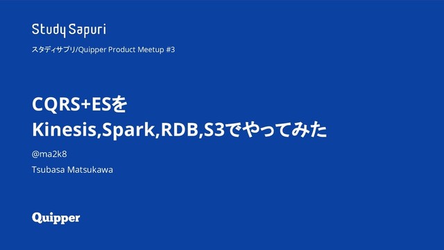 #sapurimeetup CQRS+ESをKinesis,Spark,RDB,S3でやってみた CQRS+ESを Kinesis,Spark,RDB,S3でやってみた @ma2k8 Tsubasa Matsukawa スタディサプリ/Quipper Product Meetup