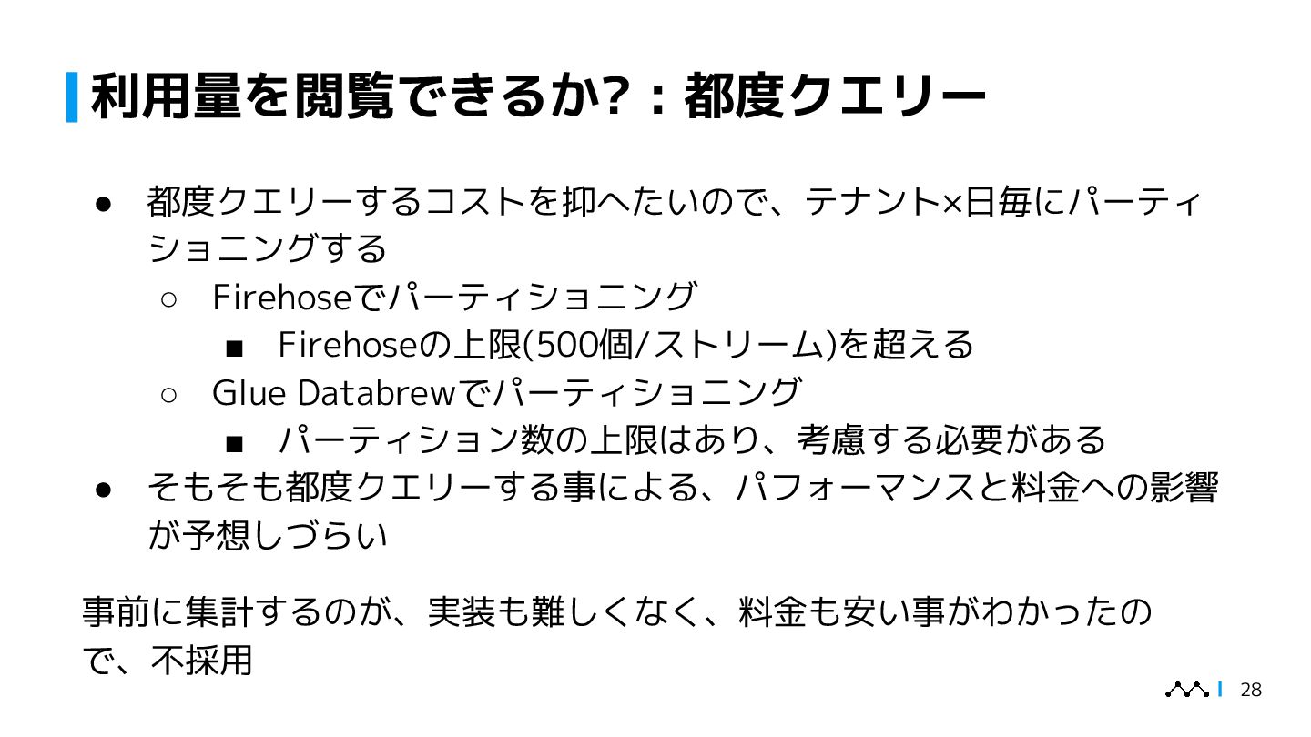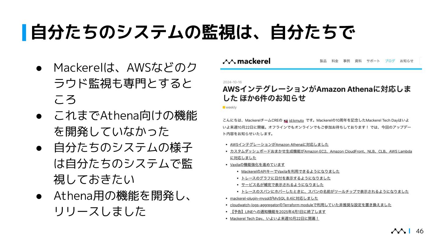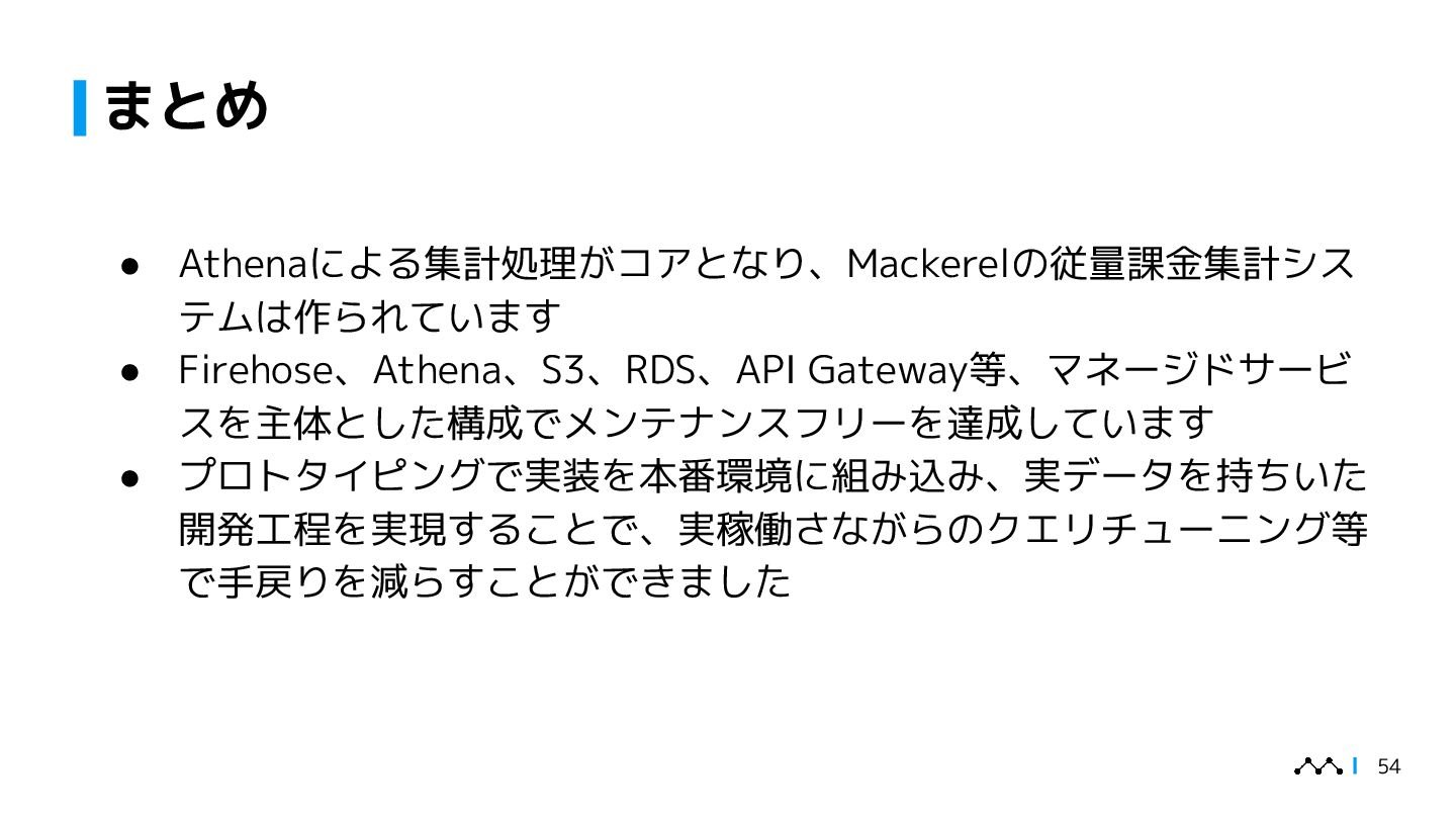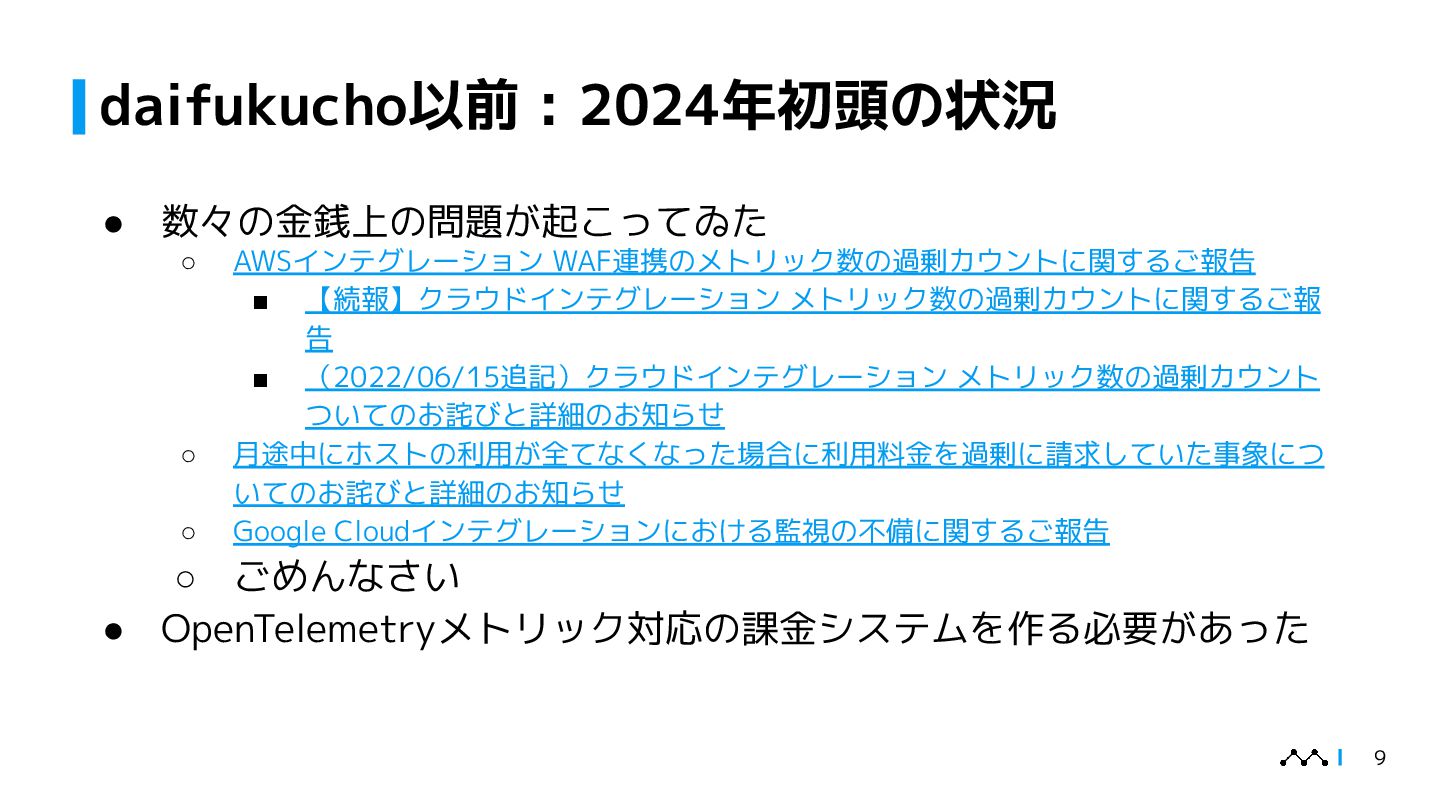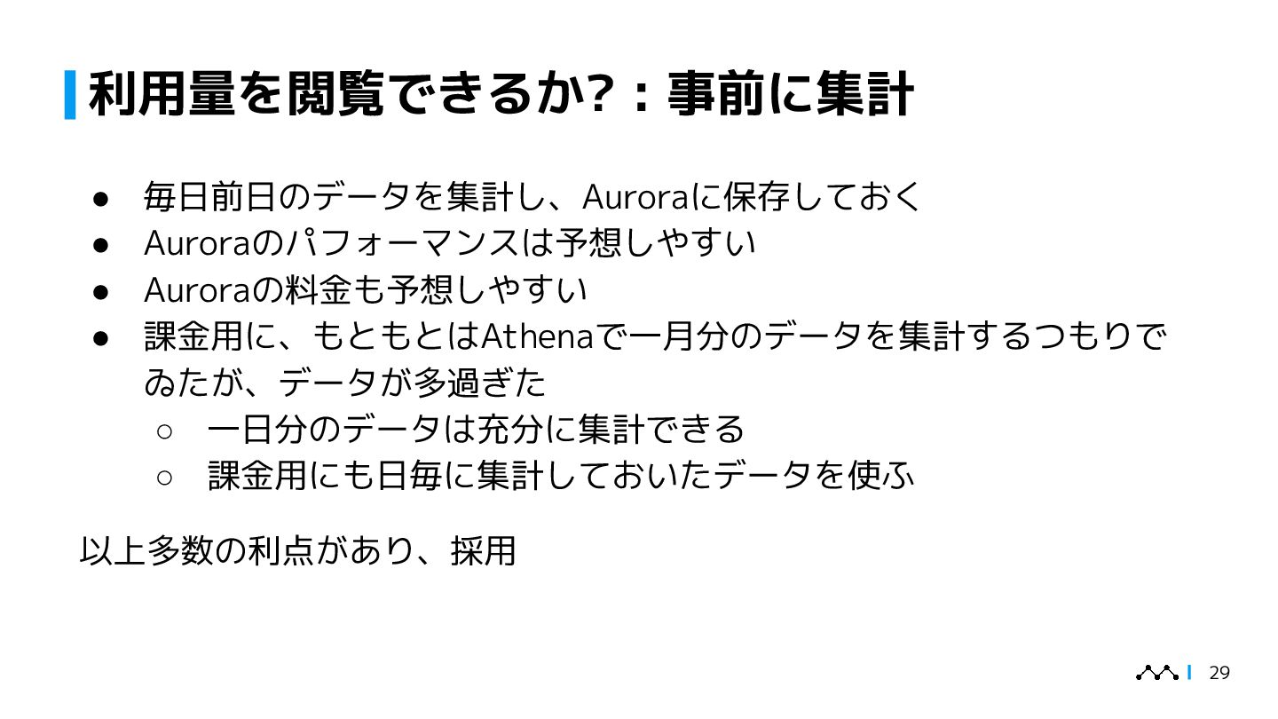 本講演では、はてなが提供するオブザーバビリティプラットフォームMackerelの従量課金集計システム「daifukucho」の設計と運用を紹介します。Mackerelは2024年末にOpenTelemetryへ正式対応し、メトリック・スパン単位での課金体系が必要となりました。daifukuchoは課金根拠を後から検証でき、利用状況をユーザーに可視化することを目的に構築されました。AWS上にDataFirehose、StepFunctions、Athena等を組み合わせ、ほぼ生データを蓄積するシンプルな構成で、大量のデータを長期間安全に保存しつつ低コストで集計を実現しています。設計の背景には、課金への信頼性確保やユーザーへの透明性提供といった要求がありました。講演ではこのアーキテクチャに至った経緯、開発を安全に進めた工夫、さらに運用中に発生したトラブル事例を共有し、従量課金システムを支える技術と課題解決の実例を提示します。