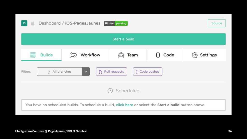 interne (temps de maintenance important) • Divers problèmes : OSX ou Xcode pas à jour, problèmes réseaux, simulateur qui plante, etc... Il nous fallait quelque chose de plus efficace ! L'Intégra*on Con*nue @ PagesJaunes / BBL 3 Octobre 11