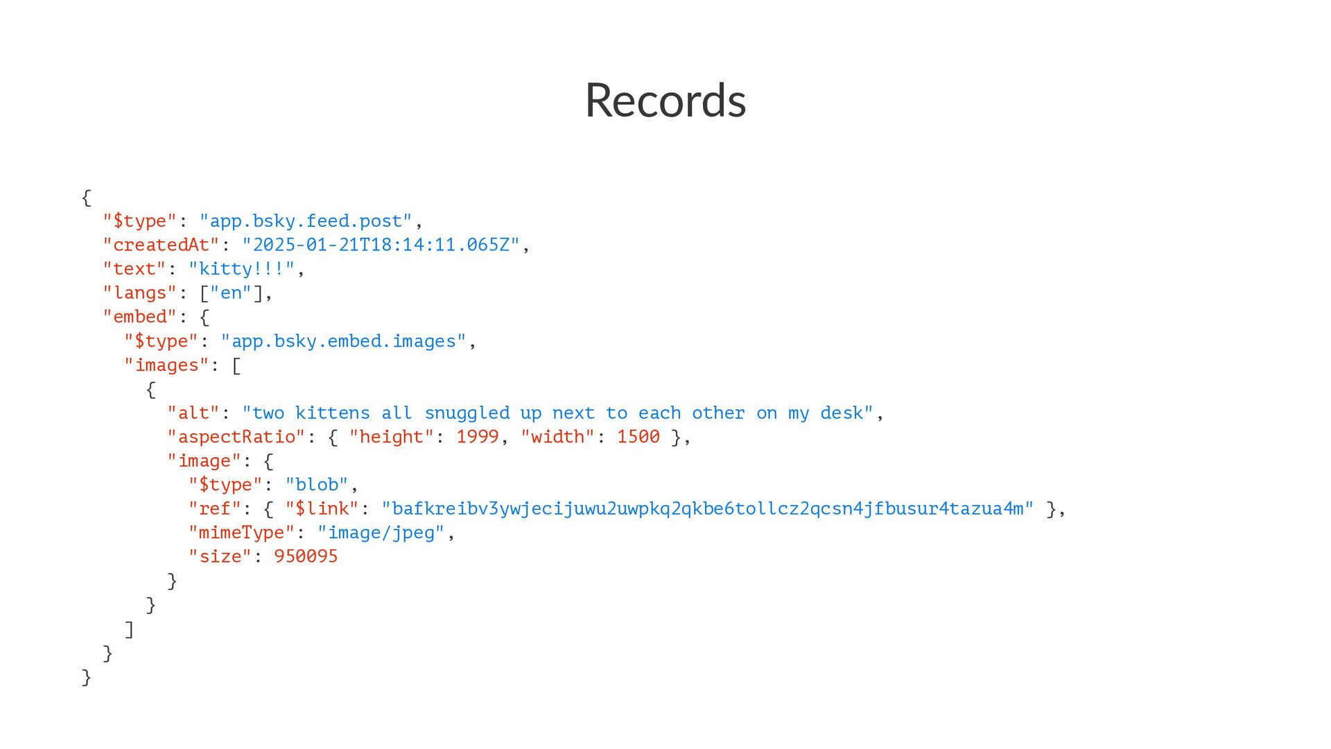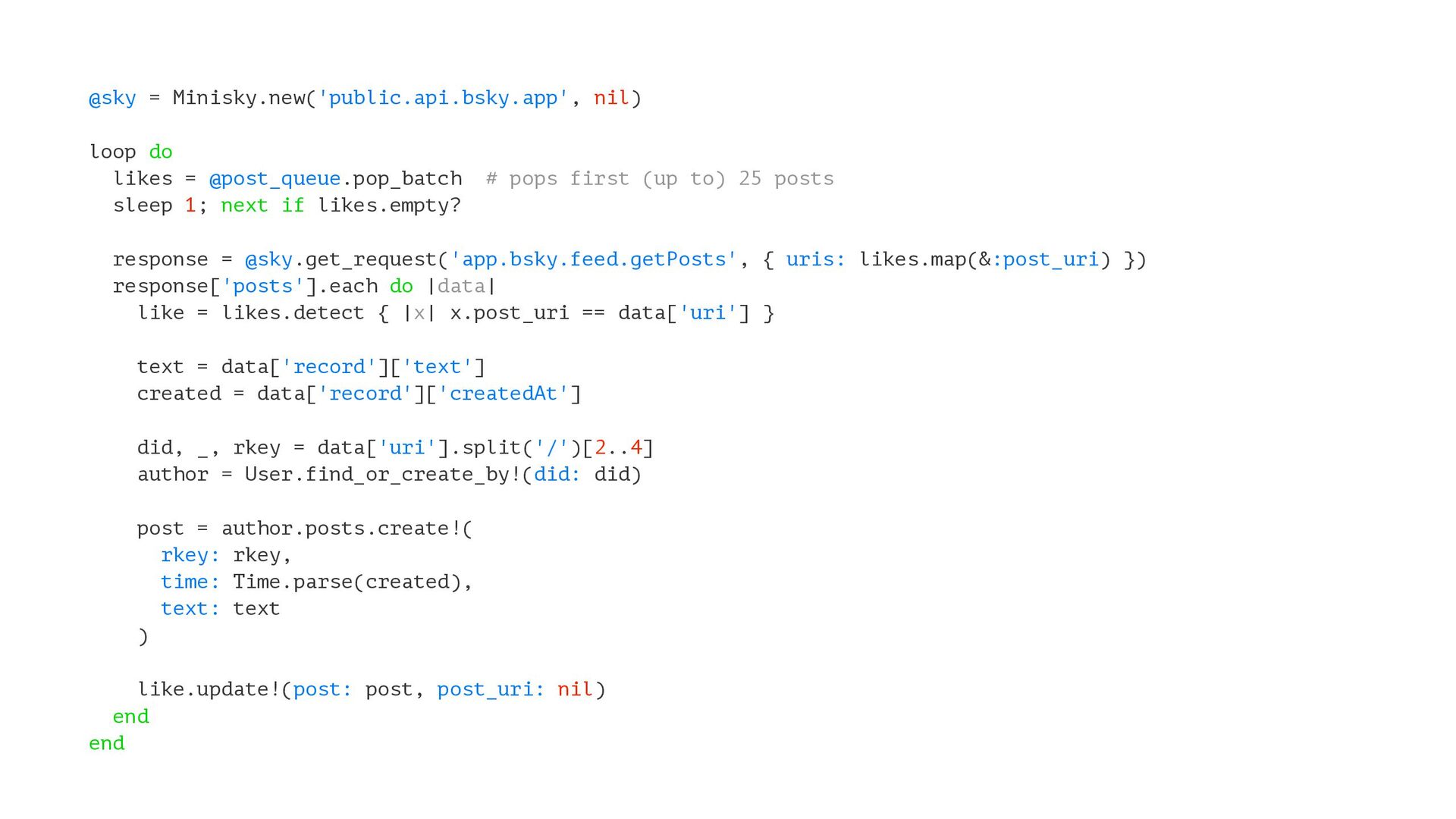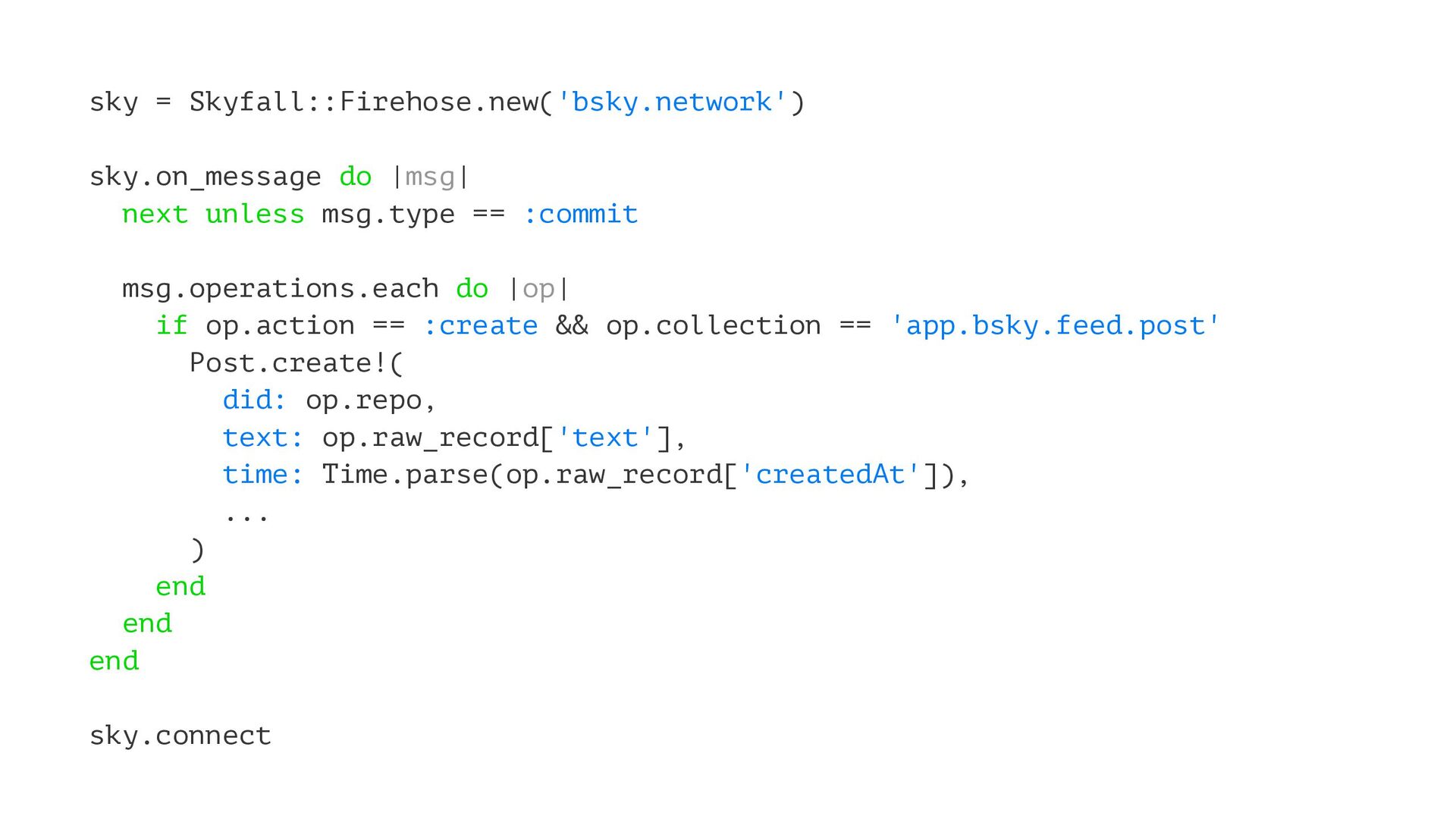 :commit msg.operations.each do |op| if op.action == :create && op.collection == 'app.bsky.feed.post' Post.create!( did: op.repo, text: op.raw_record['text'], time: Time.parse(op.raw_record['createdAt']), ... ) end end end sky.connect