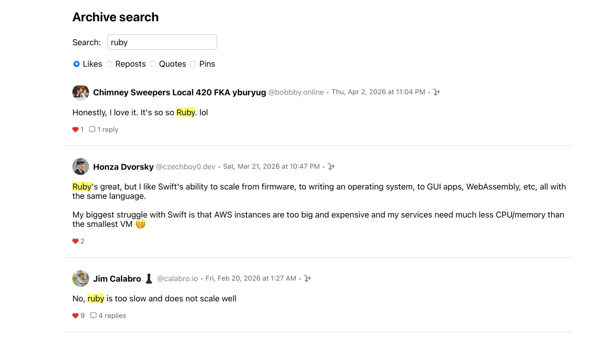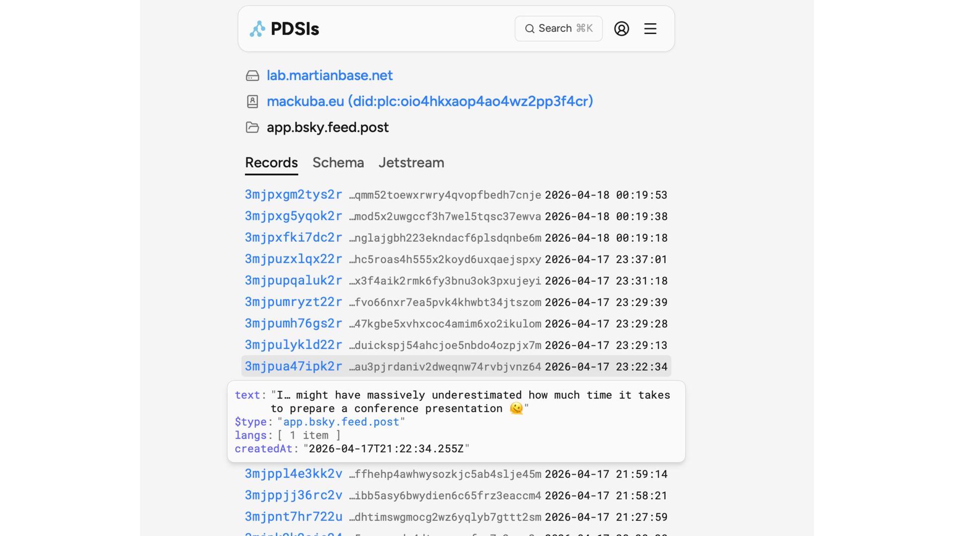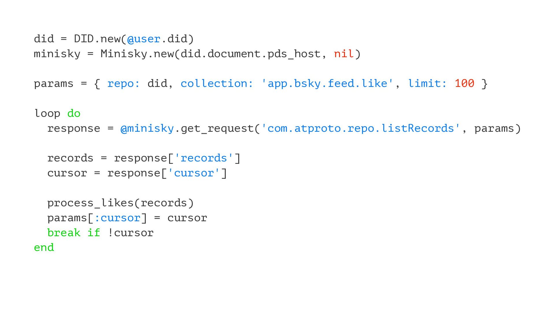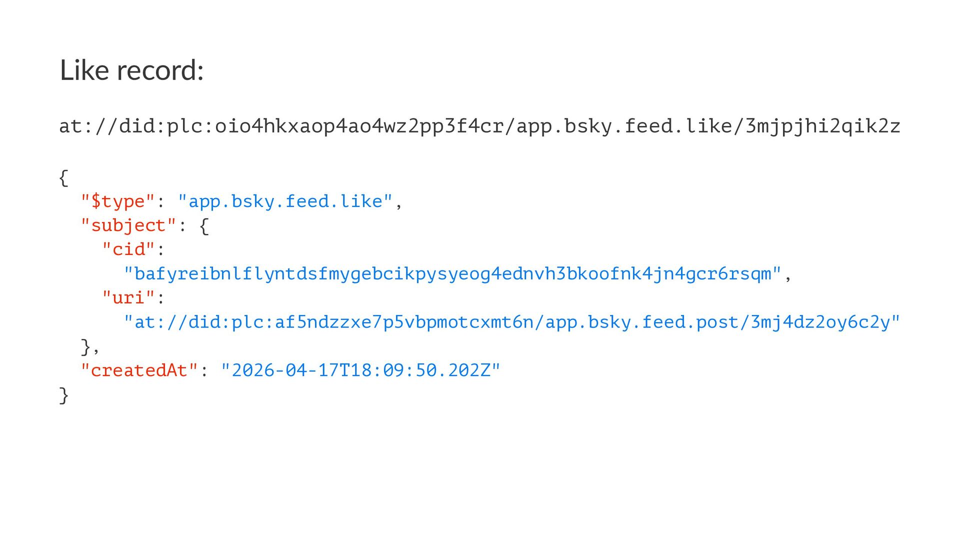 :commit msg.operations.each do |op| if op.action == :create && op.collection == 'app.bsky.feed.post' Post.create!( did: op.repo, text: op.raw_record['text'], time: Time.parse(op.raw_record['createdAt']), ... ) end end end sky.connect